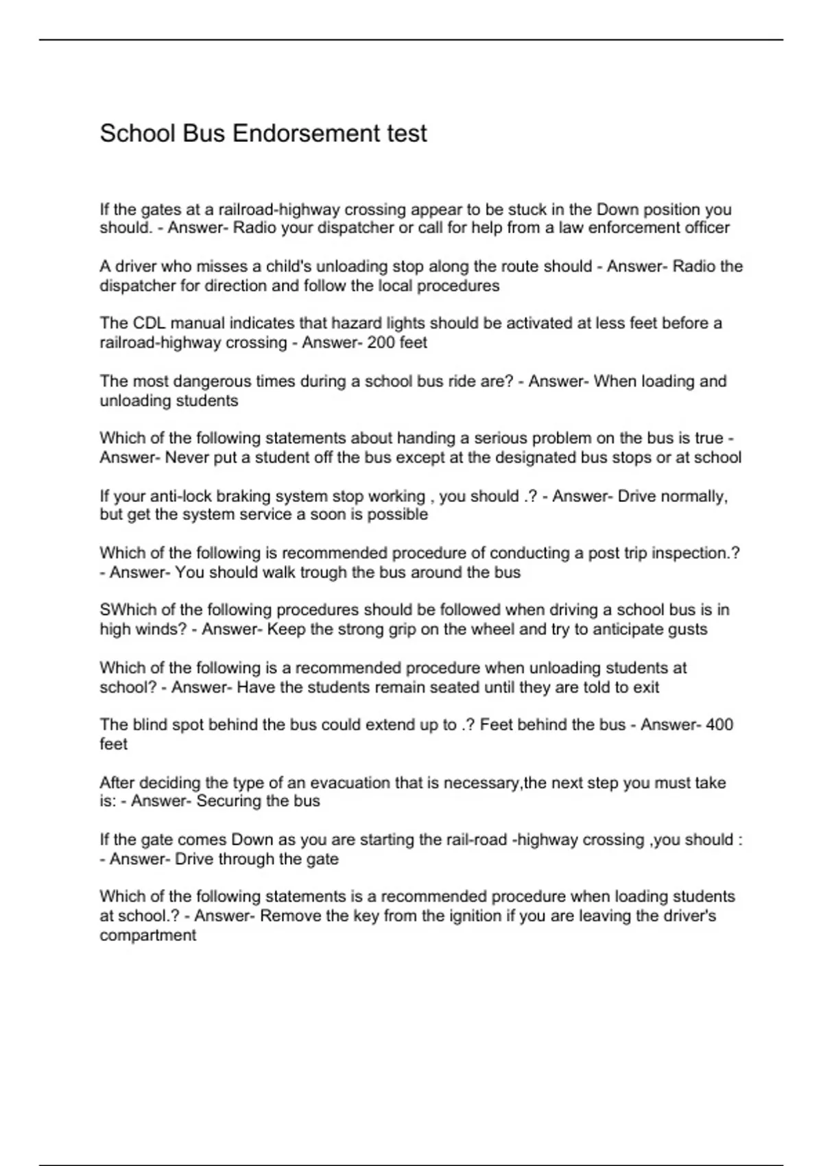 If the gates at a railroad-highway crossing appear to be stuck in the Down position you should. - Answer- Radio your dispatcher or call for help from a law enforcement officer A driver who misses a child's unloading stop along the route should - Answer- Radio the dispatcher for direction and follow the local procedures The CDL manual indicates that hazard lights should be activated at less feet before a railroad-highway crossing - Answer- 200 feet The most dangerous times during a school bus ride are? - Answer- When loading and unloading students Which of the following statements about handing a serious problem on the bus is true - Answer- Never put a student off the bus except at the designated bus stops or at school If your anti-lock braking system stop working , you should .? - Answer- Drive normally, but get the system service a soon is possible Which of the following is recommended procedure of conducting a post trip inspection.? - Answer- You should walk trough the bus around the bus SWhich of the following procedures should be followed when driving a school bus is in high winds? - Answer- Keep the strong grip on the wheel and try to anticipate gusts Which of the following is a recommended procedure when unloading students at school? - Answer- Have the students remain seated until they are told to exit The blind spot behind the bus could extend up to .? Feet behind the bus - Answer- 400 feet After deciding the type of an evacuation that is necessary,the next step you must take is: - Answer- Securing the bus If the gate comes Down as you are starting the rail-road -highway crossing ,you should : - Answer- Drive through the gate Which of the following statements is a recommended procedure when loading students at school.? - Answer- Remove the key from the ignition if you are leaving the driver's compartment