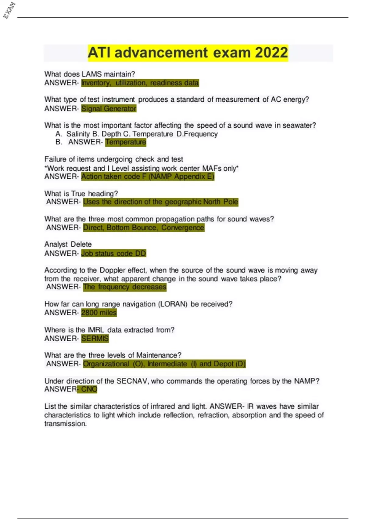 What does LAMS maintain? ANSWER- Inventory, utilization, readiness data What type of test instrument produces a standard of measurement of AC energy? ANSWER- Signal Generator What is the most important factor affecting the speed of a sound wave in seawater? A. Salinity B. Depth C. Temperature D.Frequency B. ANSWER- Temperature Failure of items undergoing check and test *Work request and I Level assisting work center MAFs only* ANSWER- Action taken code F (NAMP Appendix E) What is True heading? ANSWER- Uses the direction of the geographic North Pole What are the three most common propagation paths for sound waves? ANSWER- Direct, Bottom Bounce, Convergence Analyst Delete ANSWER- Job status code DD According to the Doppler effect, when