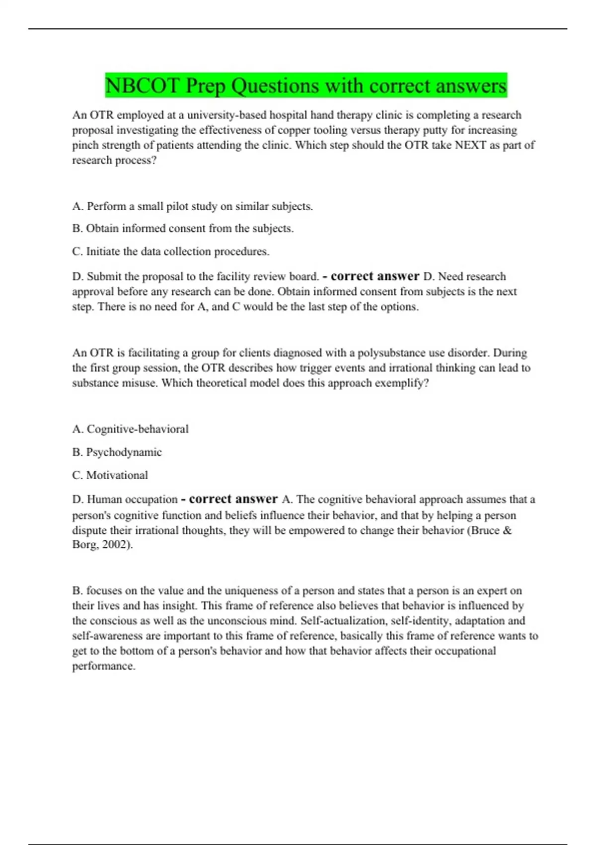 An OTR employed at a university-based hospital hand therapy clinic is completing a research proposal investigating the effectiveness of copper tooling versus therapy putty for increasing pinch strength of patients attending the clinic. Which step should the OTR take NEXT as part of research process? A. Perform a small pilot study on similar subjects. B. Obtain informed consent from the subjects. C. Initiate the data collection procedures. D. Submit the proposal to the facility review board. - correct answer D. Need research approval before any research can be done. Obtain informed consent from subjects is the next step. There is no need for A, and C would be the last step of the options. An OTR is facilitating a group for clients diagnosed with a polysubstance use disorder. During the first group session, the OTR describes how trigger events and irrational thinking can lead to substance misuse. Which theoretical model does this approach exemplify? A. Cognitive-behavioral B. Psychodynamic C. Motivational D. Human occupation - correct answer A. The cognitive behavioral approach assumes that a person's cognitive function and beliefs influence their behavior, and that by helping a person dispute their irrational thoughts, they will be empowered to change their behavior (Bruce & Borg, 2002). B. focuses on the value and the uniqueness of a person and states that a person is an expert on their lives and has insight. This frame of reference also believes that behavior is influenced by the conscious as well as the unconscious mind. Self-actualization, self-identity, adaptation and self-awareness are important to this frame of reference, basically this frame of reference wants to get to the bottom of a person's behavior and how that behavior affects their occupational performance. An OTR is planning a group for clients who have mild-moderate cognitive decline secondary to Alzheimer's disease. One of the group goals is for the clients to follow directions to complete a tile picture frame. The OTR plans to use a directive leadership style during the group. Which strategy illustrates the use of this group leadership style?