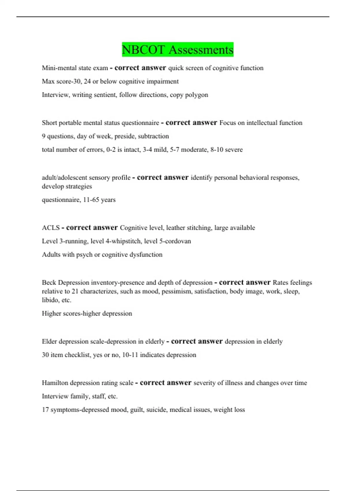Mini-mental state exam - correct answer quick screen of cognitive function Max score-30, 24 or below cognitive impairment Interview, writing sentient, follow directions, copy polygon Short portable mental status questionnaire - correct answer Focus on intellectual function 9 questions, day of week, preside, subtraction total number of errors, 0-2 is intact, 3-4 mild, 5-7 moderate, 8-10 severe adult/adolescent sensory profile - correct answer identify personal behavioral responses, develop strategies questionnaire, 11-65 years ACLS - correct answer Cognitive level, leather stitching, large available Level 3-running, level 4-whipstitch, level 5-cordovan Adults with psych or cognitive dysfunction Beck Depression inventory-presence and depth of depression - correct answer Rates feelings relative to 21 characterizes, such as mood, pessimism, satisfaction, body image, work, sleep, libido, etc. Higher scores-higher depression Elder depression scale-depression in elderly - correct answer depression in elderly 30 item checklist, yes or no, 10-11 indicates depression Hamilton depression rating scale - correct answer severity of