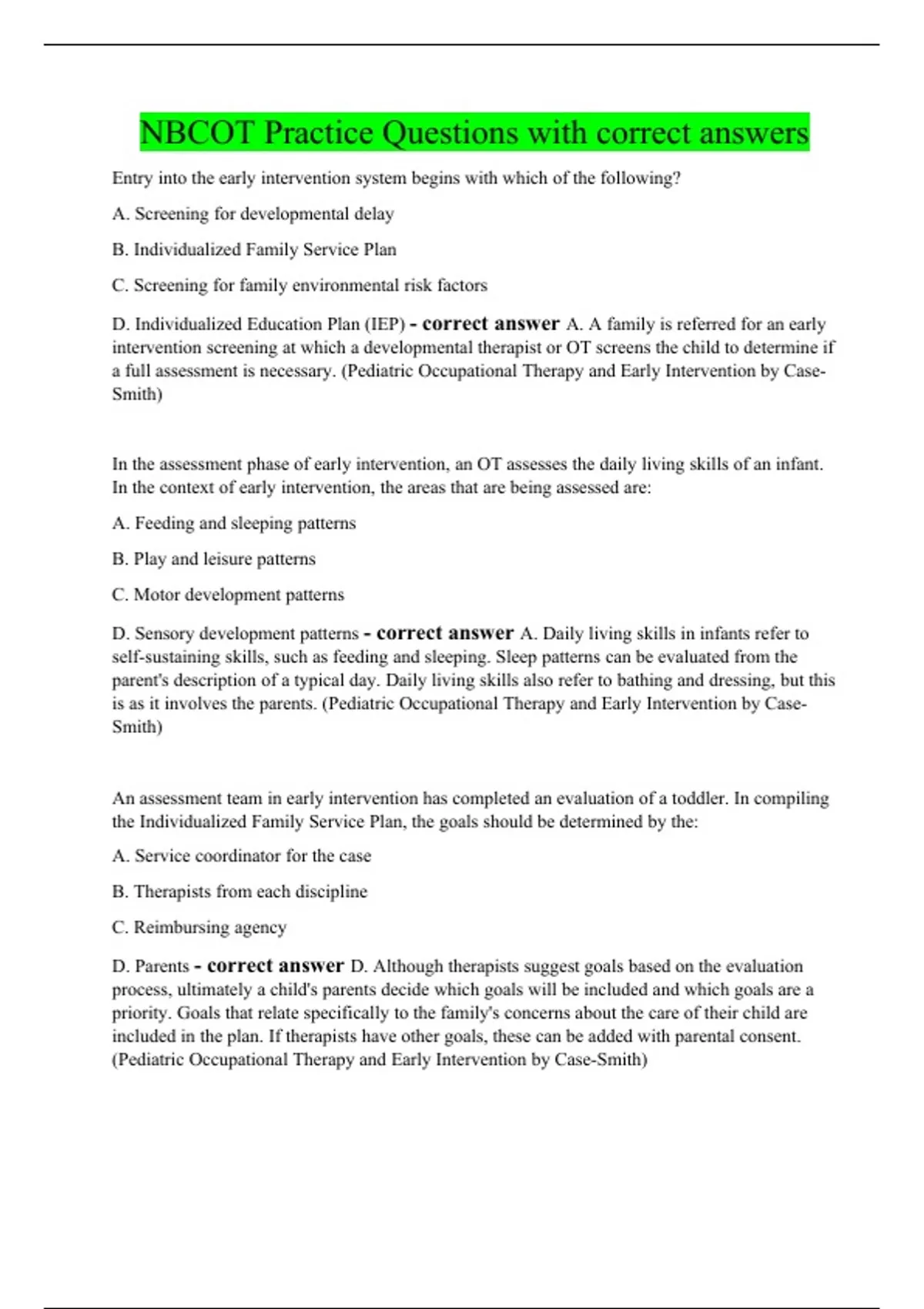 Entry into the early intervention system begins with which of the following? A. Screening for developmental delay B. Individualized Family Service Plan C. Screening for family environmental risk factors D. Individualized Education Plan (IEP) - correct answer A. A family is referred for an early intervention screening at which a developmental therapist or OT screens the child to determine if a full assessment is necessary. (Pediatric Occupational Therapy and Early Intervention by Case-Smith) In the assessment phase of early intervention, an OT assesses the daily living skills of an infant. In the context of early intervention, the areas that are being assessed are: A. Feeding and sleeping patterns B. Play and leisure patterns C. Motor development patterns D. Sensory development patterns - correct answer A. Daily living skills in infants refer to self-sustaining skills, such as feeding and sleeping. Sleep patterns can be evaluated from the parent's description of a typical day. Daily living skills also refer to bathing and dressing, but this is as it involves the parents. (Pediatric Occupational Therapy and Early Intervention by Case-Smith) An assessment team in early intervention has completed an evaluation of a toddler. In compiling the Individualized Family Service Plan, the goals should be determined by the: A. Service coordinator for the case B. Therapists from each discipline C. Reimbursing agency D. Parents - correct answer D. Although therapists suggest goals based on the evaluation process, ultimately a child's parents decide which goals will be included and which goals are a priority. Goals that relate specifically to the family's concerns about the care of their child are included in the plan. If therapists have other goals, these can be added with parental consent. (Pediatric Occupational Therapy and Early Intervention by Case-Smith) In early intervention there are different types of risk factors. A child with