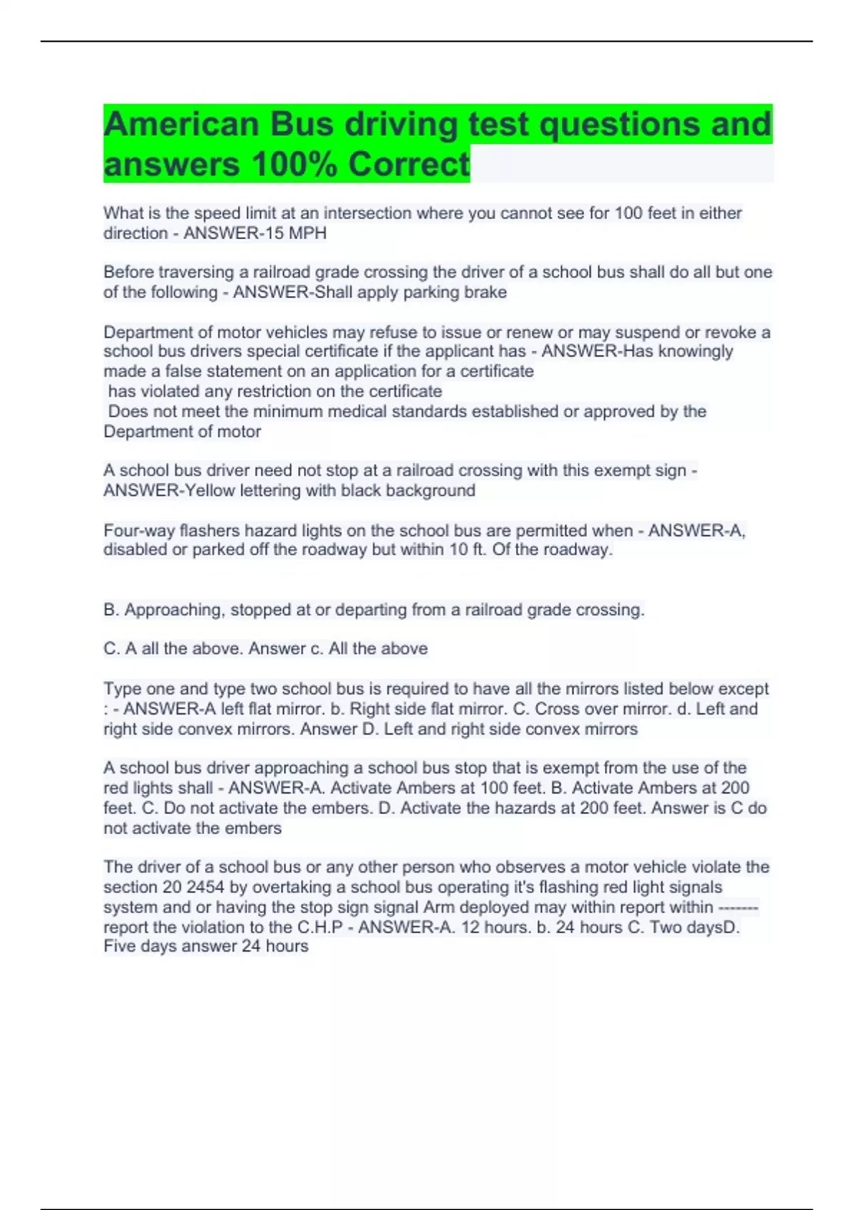 What is the speed limit at an intersection where you cannot see for 100 feet in either direction - ANSWER-15 MPH Before traversing a railroad grade crossing the driver of a school bus shall do all but one of the following - ANSWER-Shall apply parking brake Department of motor vehicles may refuse to issue or renew or may suspend or revoke a school bus drivers special certificate if the applicant has - ANSWER-Has knowingly made a false statement on an application for a certificate has violated any restriction on the certificate Does not meet the minimum medical standards established or approved by the Department of motor A school bus driver need not stop at a railroad crossing with this exempt sign - ANSWER-Yellow lettering with black background Four-way flashers hazard lights on the school bus are permitted when - ANSWER-A, disabled or parked off the roadway but within 10 ft. Of the roadway. B. Approaching, stopped at or departing from a railroad grade crossing. C. A all the above. Answer c. All the above Type one and type two school bus is required to have all the mirrors listed below except : - ANSWER-A left flat mirror. b. Right side flat mirror. C. Cross over mirror. d. Left and right side convex mirrors. Answer D. Left and right side convex mirrors A school bus driver approaching a school bus stop that is exempt from the use of the red lights shall - ANSWER-A. Activate Ambers at 100 feet. B. Activate Ambers at 200 feet. C. Do not activate the embers. D. Activate the hazards at 200 feet. Answer is C do not activate the embers The driver of a school bus or any other person who observes a motor vehicle violate the section 20 2454 by overtaking a school bus operating it's flashing red light signals system and or having the stop sign signal Arm deployed may within report within ------- report the violation to the C.H.P - ANSWER-A. 12 hours. b. 24 hours C. Two daysD. Five days answer 24 hours