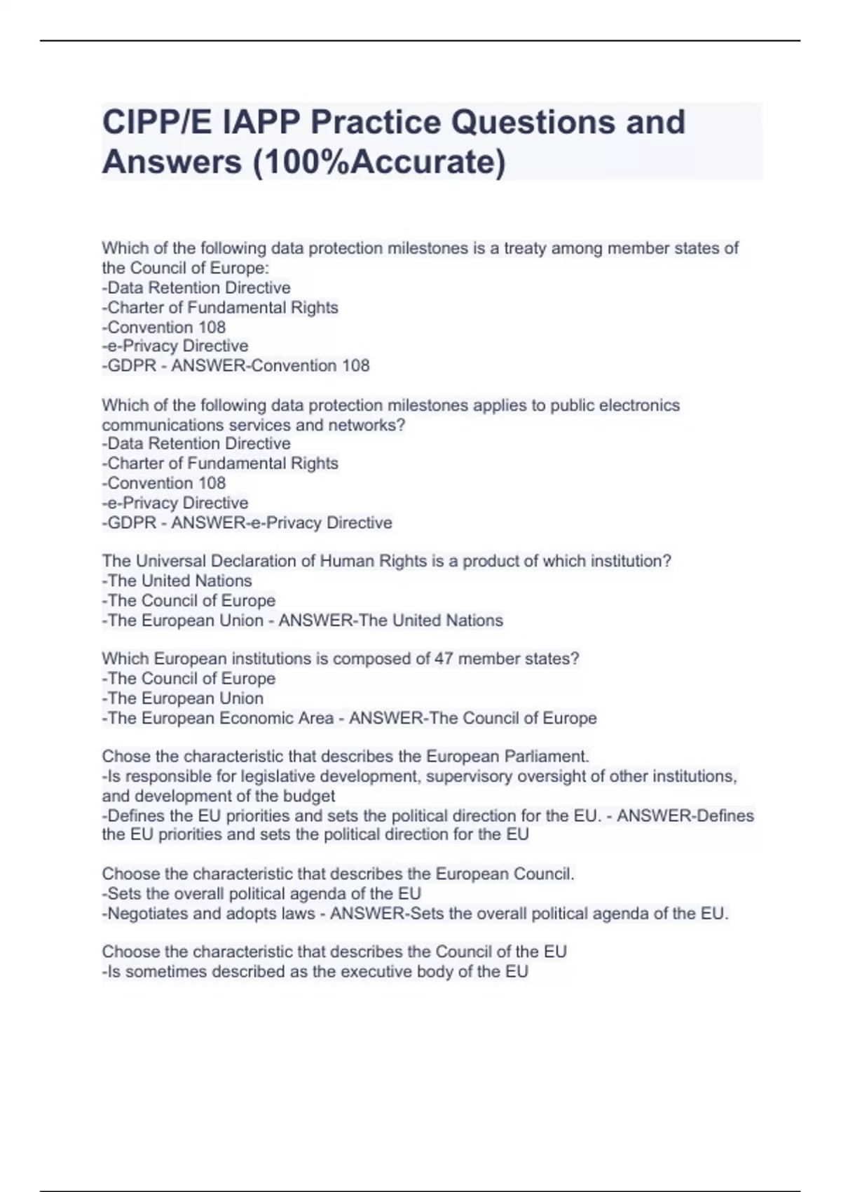 Which of the following data protection milestones is a treaty among member states of the Council of Europe: -Data Retention Directive -Charter of Fundamental Rights -Convention 108 -e-Privacy Directive -GDPR - ANSWER-Convention 108 Which of the following data protection milestones applies to public electronics communications services and networks? -Data Retention Directive -Charter of Fundamental Rights -Convention 108 -e-Privacy Directive -GDPR - ANSWER-e-Privacy Directive The Universal Declaration of Human Rights is a product of which institution? -The United Nations -The Council of Europe -The European Union - ANSWER-The United Nations Which European institutions is composed of 47 member states? -The Council of Europe -The European Union -The European Economic Area - ANSWER-The Council of Europe