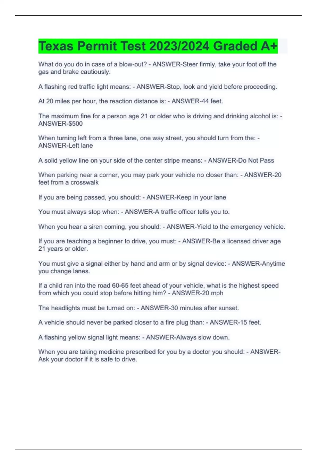 What do you do in case of a blow-out? - ANSWER-Steer firmly, take your foot off the gas and brake cautiously. A flashing red traffic light means: - ANSWER-Stop, look and yield before proceeding. At 20 miles per hour, the reaction distance is: - ANSWER-44 feet. The maximum fine for a person age 21 or older who is driving and drinking alcohol is: - ANSWER-$500 When turning left from a three lane, one way street, you should turn from the: - ANSWER-Left lane A solid yellow line on your side of the center stripe means: - ANSWER-Do Not Pass When parking near a corner, you may park your vehicle no closer than: - ANSWER-20 feet from a crosswalk If you are being passed, you should: - ANSWER-Keep in your lane You must always stop when: - ANSWER-A traffic officer tells you to. When you hear a siren coming, you should: - ANSWER-Yield to the emergency vehicle. If you are teaching a beginner to drive, you must: - ANSWER-Be a licensed driver age 21 years or older. You must give a signal either by hand and arm or by signal device: - ANSWER-Anytime you change lanes. If a child ran into the road 60-65 feet ahead of your vehicle, what is the highest speed from which you could stop before hitting him? - ANSWER-20 mph The headlights must be turned on: - ANSWER-30 minutes after sunset. A vehicle should never be parked closer to a fire plug than: - ANSWER-15 feet. A flashing yellow signal light means: - ANSWER-Always slow down. When you are taking medicine prescribed for you by a doctor you should: - ANSWER-Ask your doctor if it is safe to drive.
