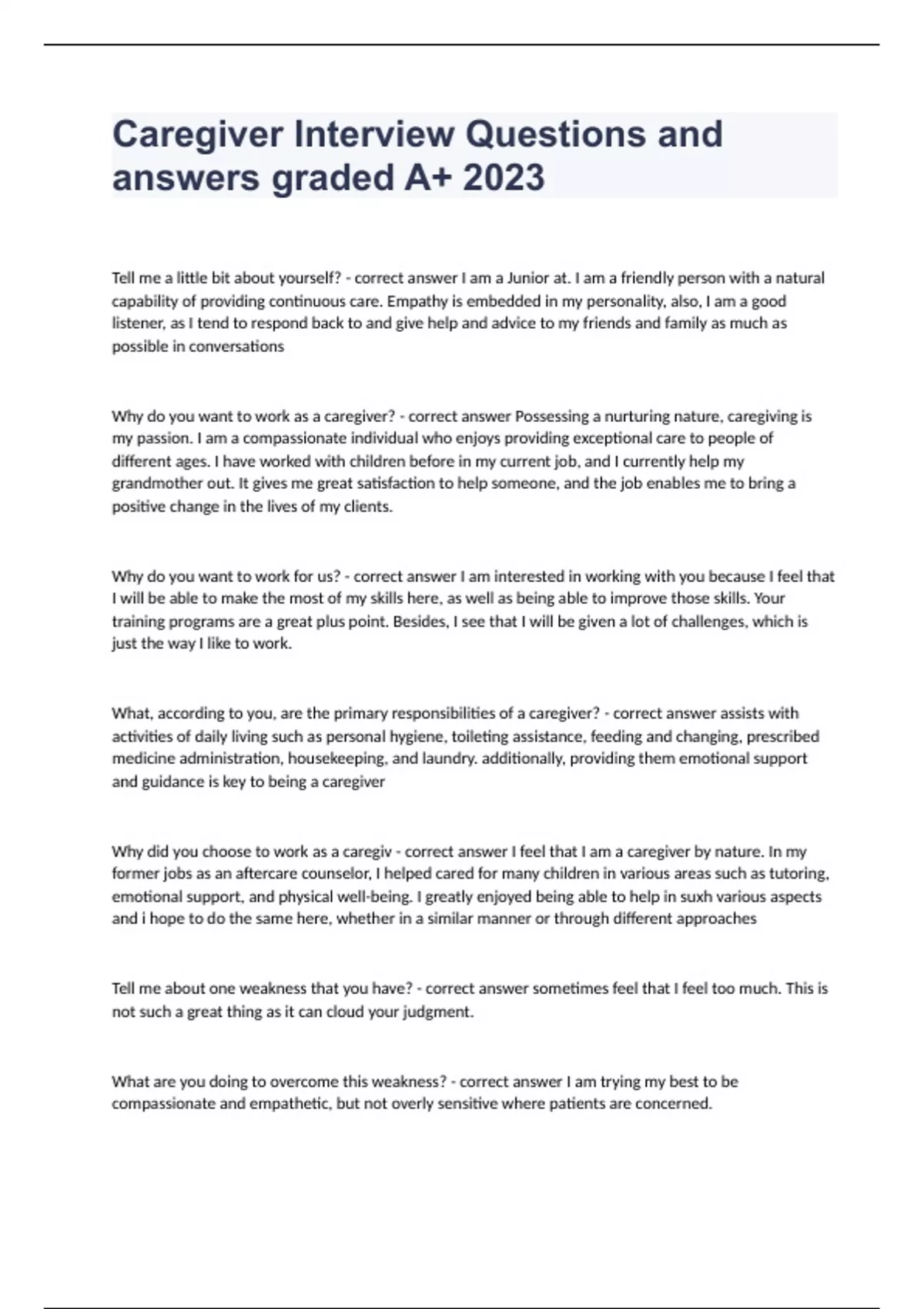 Caregiver Interview Questions and answers graded A+ 2023Tell me a little bit about yourself? - correct answer I am a Junior at. I am a friendly person with a natural capability of providing continuous care. Empathy is embedded in my personality, also, I am a good listener, as I tend to respond back to and give help and advice to my friends and family as much as possible in conversations Why do you want to work as a caregiver? - correct answer Possessing a nurturing nature, caregiving is my passion. I am a compassionate individual who enjoys providing exceptional care to people of different ages. I have worked with children before in my current job, and I currently help my grandmother out. It gives me great satisfaction to help someone, and the job enables me to bring a positive change in the lives of my clients. Why do you want to work for us? - correct answer I am interested in working with you because I feel that I will be able to make the most of my skills here, as well as being able to improve those skills. Your training programs are a great plus point. Besides, I see that I will be given a lot of challenges, which is just the way I like to work. What, according to you, are the primary responsibilities of a caregiver? - correct answer assists with activities of daily living such as personal hygiene, toileting assistance, feeding and changing, prescribed medicine administration, housekeeping, and laundry. additionally, providing them emotional support and guidance is key to being a caregiver Why did you choose to work as a caregiv - correct answer I feel that I am a caregiver by nature. In my former jobs as an aftercare counselor, I helped cared for many children in various areas such as tutoring, emotional support, and physical well-being. I greatly enjoyed being able to help in suxh various aspects and i hope to do the same here, whether in a similar manner or through different approaches Tell me about one weakness that you have? - correct answer sometimes feel that I feel too much. This is not such a great thing as it can cloud your judgment. What are you doing to overcome this weakness? - correct answer I am trying my best to be compassionate and empathetic, but not overly sensitive where patients are concerned.