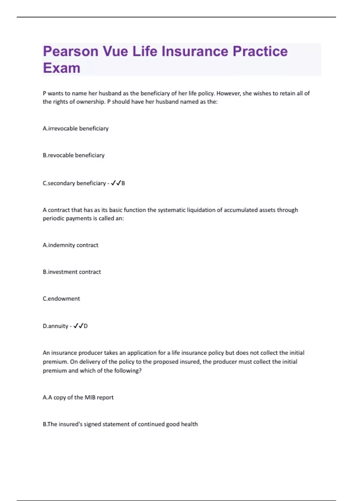 Pearson Vue Life Insurance Practice Exam | 50 Questions with 100 % Correct Answers | Verified