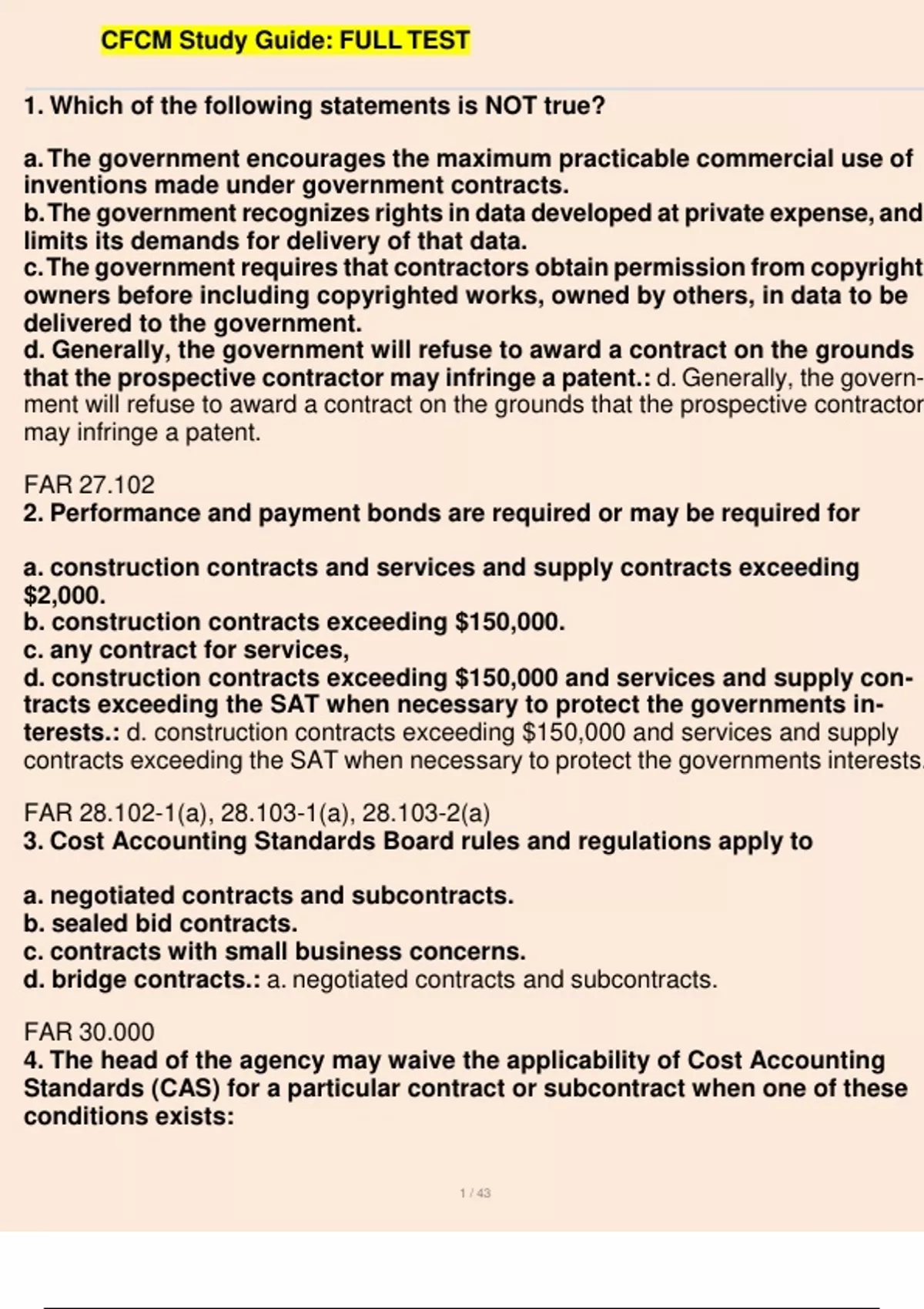 CFCM Study Guide: FULL TEST 1. Which of the following statements is NOT true? a. The government encourages the maximum practicable commercial use of inventions made under government contracts. b. The government recognizes rights in data developed at priva