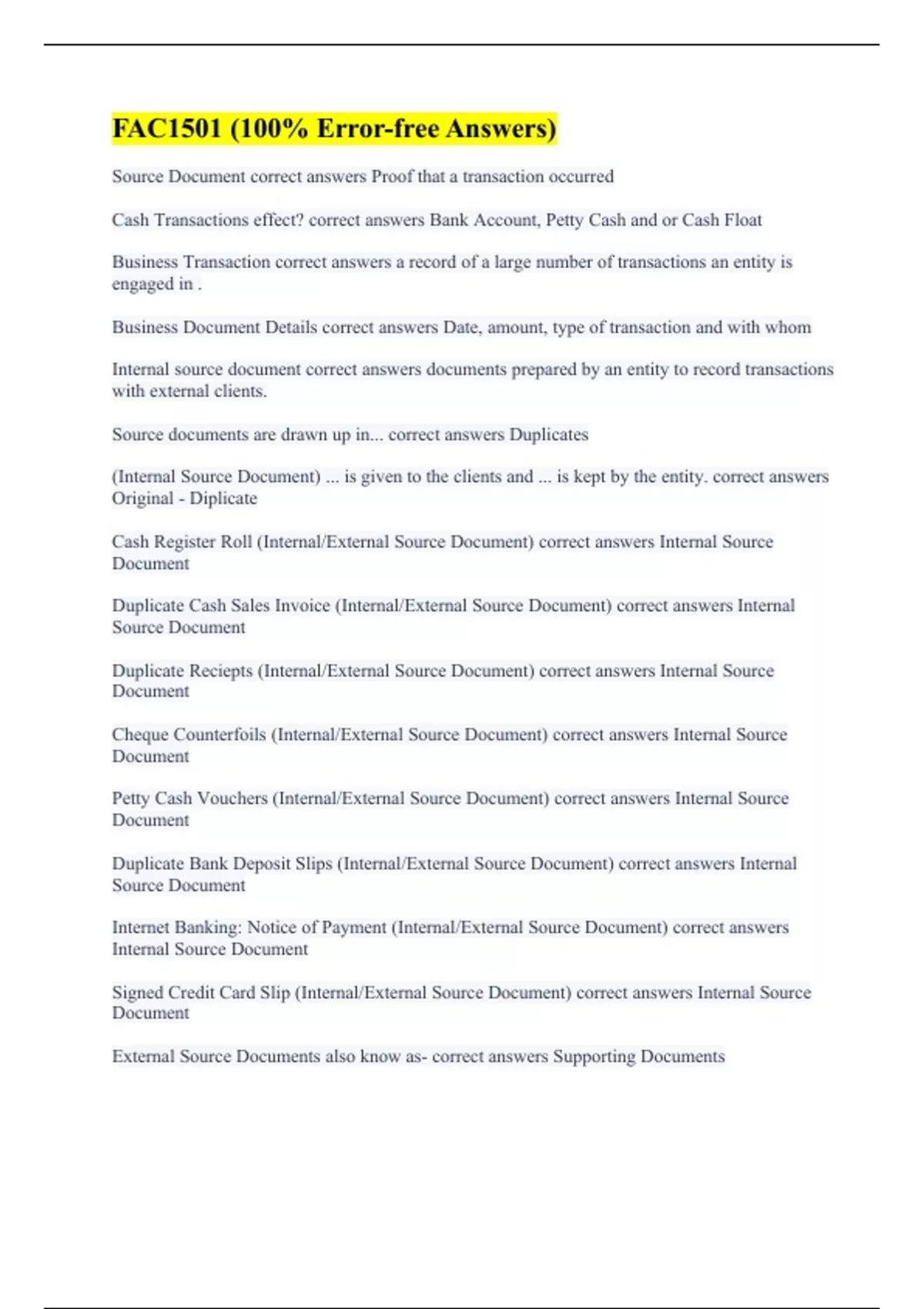 Source Document correct answers Proof that a transaction occurred Cash Transactions effect? correct answers Bank Account, Petty Cash and or Cash Float Business Transaction correct answers a record of a large number of transactions an entity is engaged in . Business Document Details correct answers Date, amount, type of transaction and with whom Internal source document correct answers documents prepared by an entity to record transactions with external clients. Source documents are drawn up in... correct answers Duplicates (Internal Source Document) ... is given to the clients and ... is kept by the entity. correct answers Original - Diplicate Cash Register Roll (Internal/External Source Document) correct answers Internal Source Document Duplicate Cash Sales Invoice (Internal/External Source Document) correct answers Internal Source Document Duplicate Reciepts (Internal/External Source Document) correct answers Internal Source Document Cheque Counterfoils (Internal/External Source Document) correct answers Internal Source Document Petty Cash Vouchers (Internal/External Source Document) correct answers Internal Source Document Duplicate Bank Deposit Slips (Internal/External Source Document) correct answers Internal Source Document Internet Banking: Notice of Payment (Internal/External Source Document) correct answers Internal Source Document Signed Credit Card Slip (Internal/External Source Document) correct answers Internal Source Document External Source Documents also know as- correct answers Supporting Documents