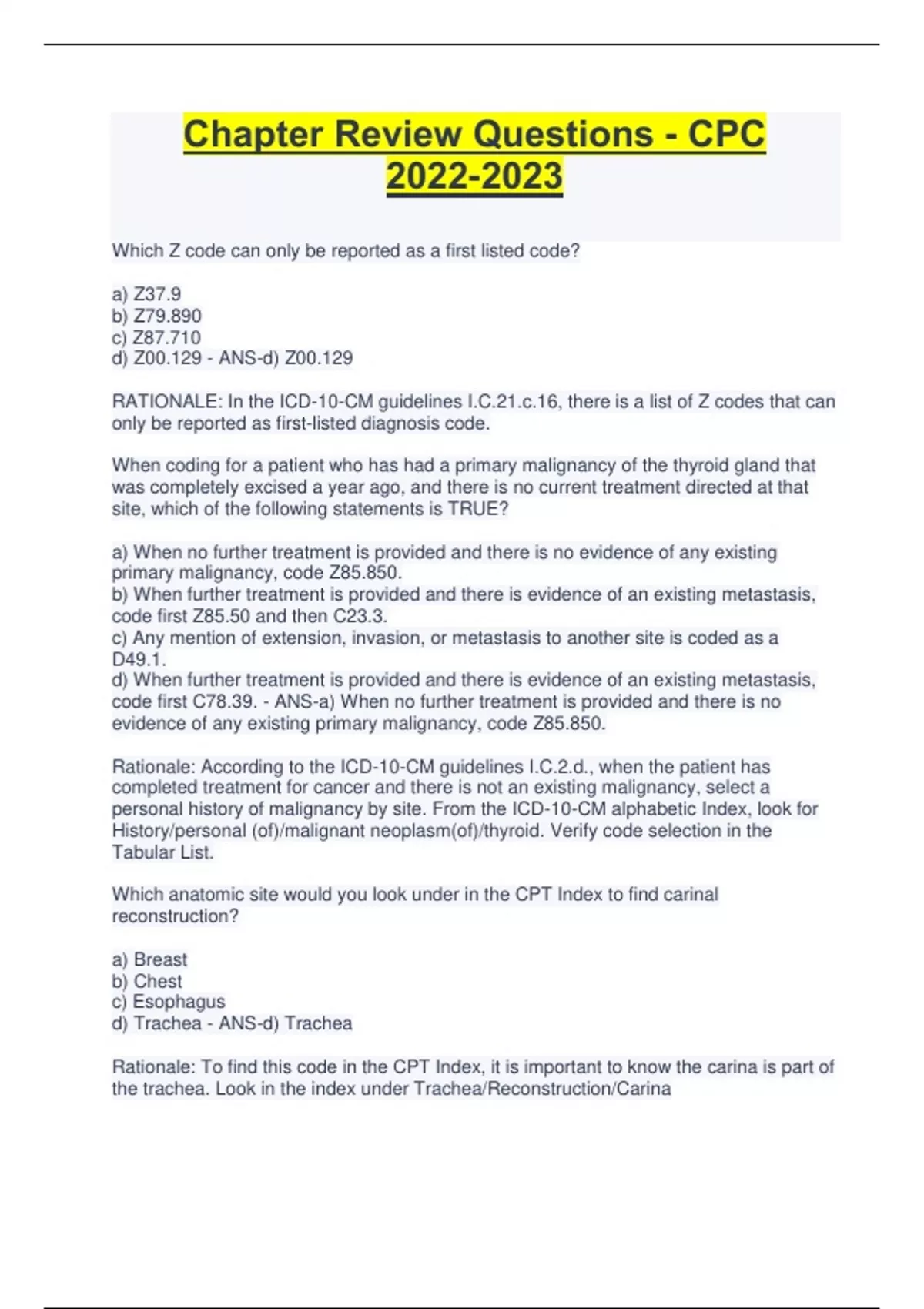 Chapter Review Questions - CPC Which Z code can only be reported as a first listed code? a) Z37.9 b) Z79.890 c) Z87.710 d) Z00.129 - ANS-d) Z00.129 RATIONALE: In the ICD-10-CM guidelines I.C.21.c.16, there is a list of Z codes that can only be reported as first-listed diagnosis code. When coding for a patient who has had a primary malignancy of the thyroid gland that was completely excised a year ago, and there is no current treatment directed at that site, which of the following statements is TRUE? a) When no further treatment is provided and there is no evidence of any existing primary malignancy, code Z85.850. b) When further treatment is provided and there is evidence of an existing metastasis, code first Z85.50 and then C23.3. c) Any mention of extension, invasion, or metastasis to another site is coded as a D49.1. d) When further treatment is provided and there is evidence of an existing metastasis, code first C78.39. - ANS-a) When no further treatment is provided and there is no evidence of any existing primary malignancy, code Z85.850. Rationale: According to the ICD-10-CM guidelines I.C.2.d., when the patient has completed treatment for cancer and there is not an existing malignancy, select a personal history of malignancy by site. From the ICD-10-CM alphabetic Index, look for History/personal (of)/malignant neoplasm(of)/thyroid. Verify code selection in the Tabular List. Which anatomic site would you look under in the CPT Index to find carinal reconstruction? a) Breast b) Chest c) Esophagus d) Trachea - ANS-d) Trachea Rationale: To find this code in the CPT Index, it is important to know the carina is part of the trachea. Look in the index under Trachea/Reconstruction/Carina When the entry point for a catheterization is the aorta, what order would the right brachial artery be considered when using Appendix L? a) First Order b) Second Order Branch c) Third Order Branch d) Beyond Third Order Branch - ANS-c) Third order Branch Rationale: In Appendix L, the vascular families are given based on the assumption the aorta is the starting point for the catheterization. The R. Brachial is a third order branch to the Innominate. According to the National Correct Coding Initiative, what edit is placed on codes 11042 and 10060? (Refer to the NCCI table provided in the chapter, page 71 of the 2022 Official Study Guide CPC Certification) a) CCM 0; a modifier will not bypass the edit b) CCM 1; a modifier will bypass the edit c) CCM 9; a modifier will not bypass the edit d) CCM 9; a modifier will bypass the edit - ANS-b) CCM1; a modifier will bypass the edit Rationale: Refer to the NCCI Table provided in this chapter. The edit for 11042 and 10060 has a modifier indicator of 1 listed next to the edit, indicating a modifier is allowed if supported by the documentation and will bypass the edit. When coding for a surgical service, which of the following is NOT included in the global surgical package? a) Digital block b) General anesthesia c) Talking with the family d) E/M encounter on the date immediately prior to a major procedure - ANS-b) General anesthesia Rationale: a digital block or topical anesthesia, talking with the family and other physicians, and the E/M prior to a major surgery and during the postoperative care are all considered included in a CPT surgical code. General anesthesia would be reported separately. How often does CMS release updates for HCPCS Level II codes?...