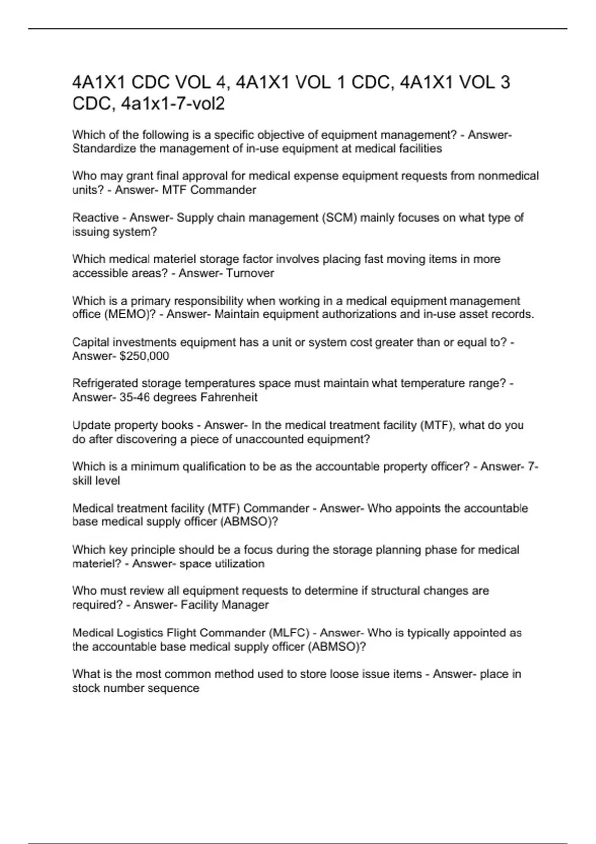 Which of the following is a specific objective of equipment management? - Answer- Standardize the management of in-use equipment at medical facilities Who may grant final approval for medical expense equipment requests from nonmedical units? - Answer- MTF Commander Reactive - Answer- Supply chain management (SCM) mainly focuses on what type of issuing system? Which medical materiel storage factor involves placing fast moving items in more accessible areas? - Answer- Turnover Which is a primary responsibility when working in a medical equipment management office (MEMO)? - Answer- Maintain equipment authorizations and in-use asset records. Capital investments equipment has a unit or system cost greater than or equal to? - Answer- $250,000 Refrigerated storage temperatures space must maintain what temperature range? - Answer- 35-46 degrees Fahrenheit Update property books - Answer- In the medical treatment facility (MTF), what do you do after discovering a piece of unaccounted equipment? Which is a minimum qualification to be as the accountable property officer? - Answer- 7-skill level Medical treatment facility (MTF) Commander - Answer- Who appoints the accountable base medical supply officer (ABMSO)? Which key principle should be a focus during the storage planning phase for medical materiel? - Answer- space utilization Who must review all equipment requests to determine if structural changes are required? - Answer- Facility Manager Medical Logistics Flight Commander (MLFC) - Answer- Who is typically appointed as the accountable base medical supply officer (ABMSO)? What is the most common method used to store loose issue items - Answer- place in st