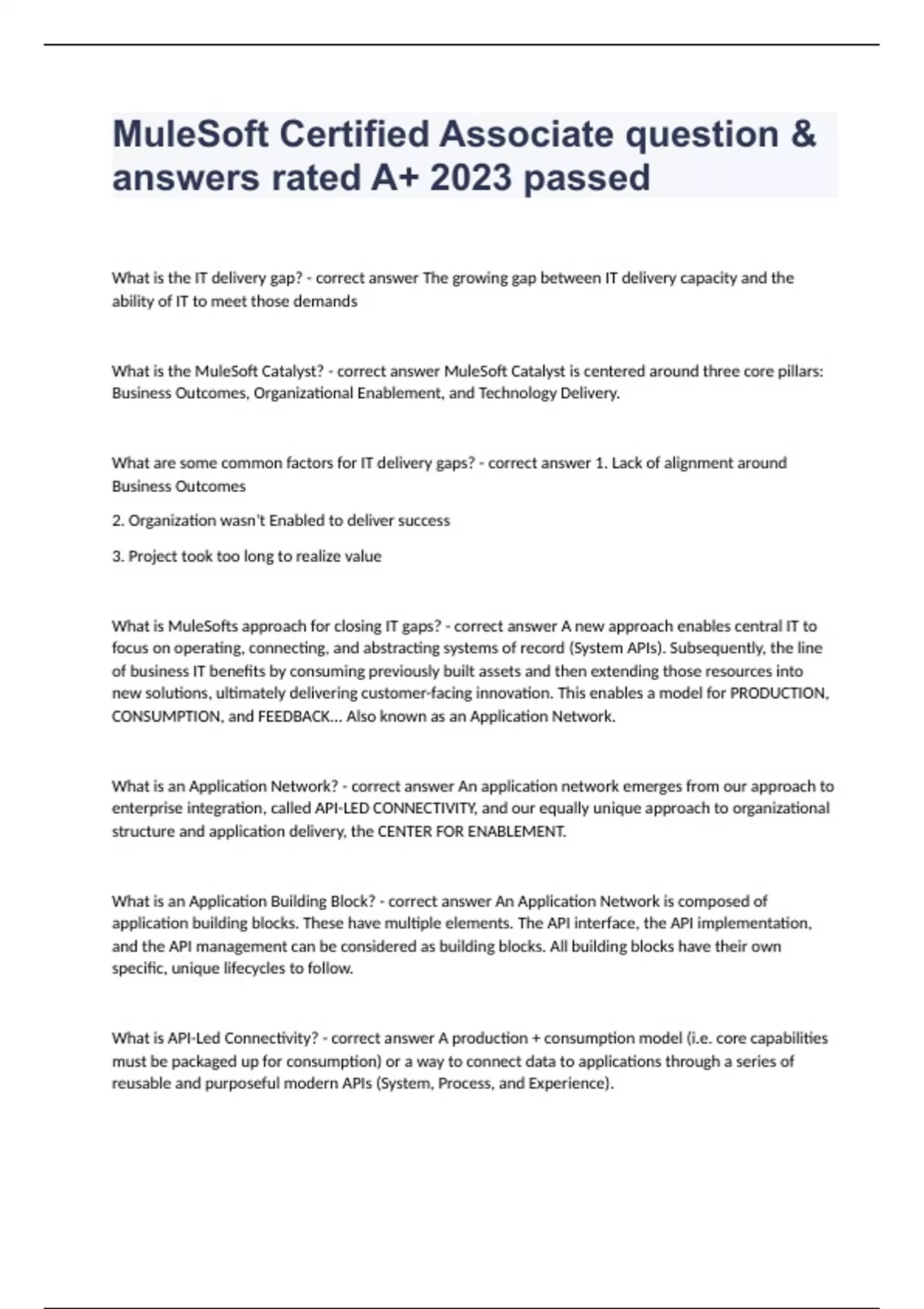 MuleSoft Certified Associate question & answers rated A+ 2023 passedWhat is the IT delivery gap? - correct answer The growing gap between IT delivery capacity and the ability of IT to meet those demands What is the MuleSoft Catalyst? - correct answer MuleSoft Catalyst is centered around three core pillars: Business Outcomes, Organizational Enablement, and Technology Delivery. What are some common factors for IT delivery gaps? - correct answer 1. Lack of alignment around Business Outcomes 2. Organization wasn't Enabled to deliver success 3. Project took too long to realize value What is MuleSofts approach for closing IT gaps? - correct answer A new approach enables central IT to focus on operating, connecting, and abstracting systems of record (System APIs). Subsequently, the line of business IT benefits by consuming previously built assets and then extending those resources into new solutions, ultimately delivering customer-facing innovation. This enables a model for PRODUCTION, CONSUMPTION, and FEEDBACK... Also known as an Application Network. What is an Application Network? - correct answer An application network emerges from our approach to enterprise integration, called API-LED CONNECTIVITY, and our equally unique approach to organizational structure and application delivery, the CENTER FOR ENABLEMENT. What is an Application Building Block? - correct answer An Application Network is composed of application building blocks. These have multiple elements. The API interface, the API implementation, and the API management can be considered as building blocks. All building blocks have their own specific, unique lifecycles to follow. What is API-Led Connectivity? - correct answer A production + consumption model (i.e. core capabilities must be packaged up for consumption) or a way to connect data to applications through a series of reusable and purposeful modern APIs (System, Process, and Experience). What are System API? - correct answer System APIs provide a means of insulating the user from the complexities or any changes to the underlying systems we are trying to integrate (authenticate) with. It is focused on Connectivity. What are Process APIs? - correct answer Process APIs interact with and shape data within a single system or across systems (breaking down data silos) and are created here without a dependence on the source systems from which that data originates. This is typically where the business logic is implemented for further processing data. What are Experience APIs - correct answer Experience APIs are the means by which data can be reconfigured so that it is most easily consumed by its intended audience, all from a common data source. Experience APIs are concerned with how data is presented securely.