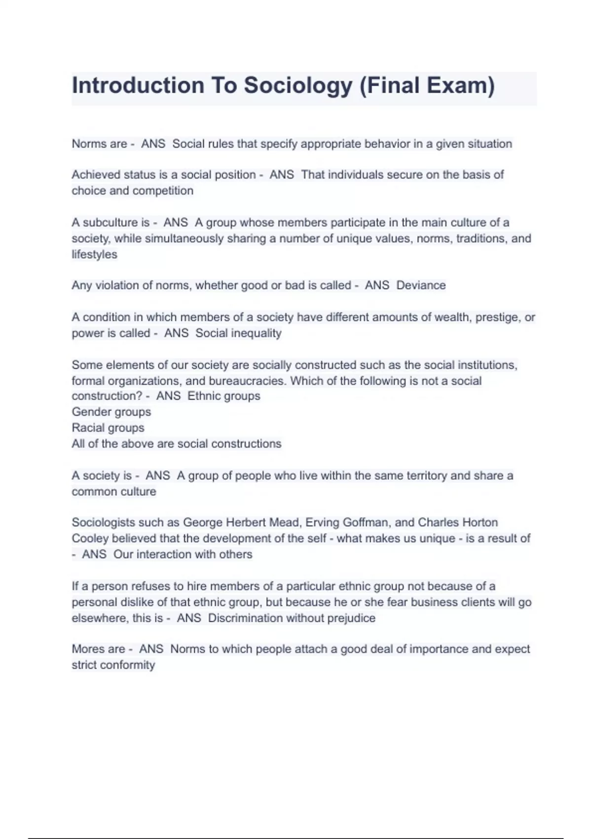 Introduction To Sociology 1 (Final Exam) Questions And Correct Verified Solutions Norms are - ANS Social rules that specify appropriate behavior in a given situation Achieved status is a social position - ANS That individuals secure on the basis of choice and competition A subculture is - ANS A group whose members participate in the main culture of a society, while simultaneously sharing a number of unique values, norms, traditions, and lifestyles Any violation of norms, whether good or bad is called - ANS Deviance A condition in which members of a society have different amounts of wealth, prestige, or power is called - ANS Social inequality Some elements of our society are socially constructed such as the social institutions, formal organizations, and bureaucracies. Which of the following is not a social construction? - ANS Ethnic groups Gender groups Racial groups All of the above are social constructions A society is - ANS A group of people who live within the same territory and share a common culture Sociologists such as George Herbert Mead, Erving Goffman, and Charles Horton Cooley believed that the development of the self - what makes us unique - is a result of - ANS Our interaction with others If a person refuses to hire members of a particular ethnic group not because of a personal dislike of that ethnic group, but because he or she fear business clients will go elsewhere, this is - ANS Discrimination without prejudice Mores are - ANS Norms to which people attach a good deal of importance and expect strict conformity Which of the following is NOT, by sociologists, regarded as a characteristic of a minority group? - ANS There are fewer of them than there are members of the dominant group Ethnocentrism refers to - ANS Belief that one's culture is "the best"; therefore, will tend to judge the behaviors of other groups by the standards of one's own culture Socialization is the process - ANS Of social interaction by which people acquire the knowledge, values, and behaviors essential for effective participation in society. A key element in sociological imagination is the ability to view one's society - ANS As an outsider Which term is used to refer to the principle instruments/means whereby the essential tasks (functional prerequisites) of living are organized, directed, and executed? - ANS Social institutions A proposition that can be tested to determine its validity is known as a - ANS Hypothesis Social constructs and social definitions - ANS Imply that meanings are produced in social interactions Which sociological perspective would view society as a system or living organism in which each part/component is related to each other and contributes to its overall survival and stability? - ANS Functionalist perspective Values are - ANS Broad ideas regarding what is desirable, correct, and good that most members of a society share Sociology is considered a science because sociologists - ANS Engage in organized and systematic stu