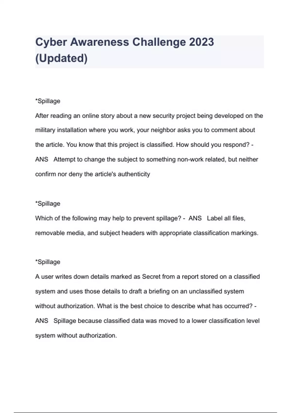 Study Guide' for Fiscal Year 2023 Cyber Awareness Challenge Knowledge Check. Some of these may seem like duplicate questions, however, the challenge draws from a pool of answers. I included the other variations that I saw