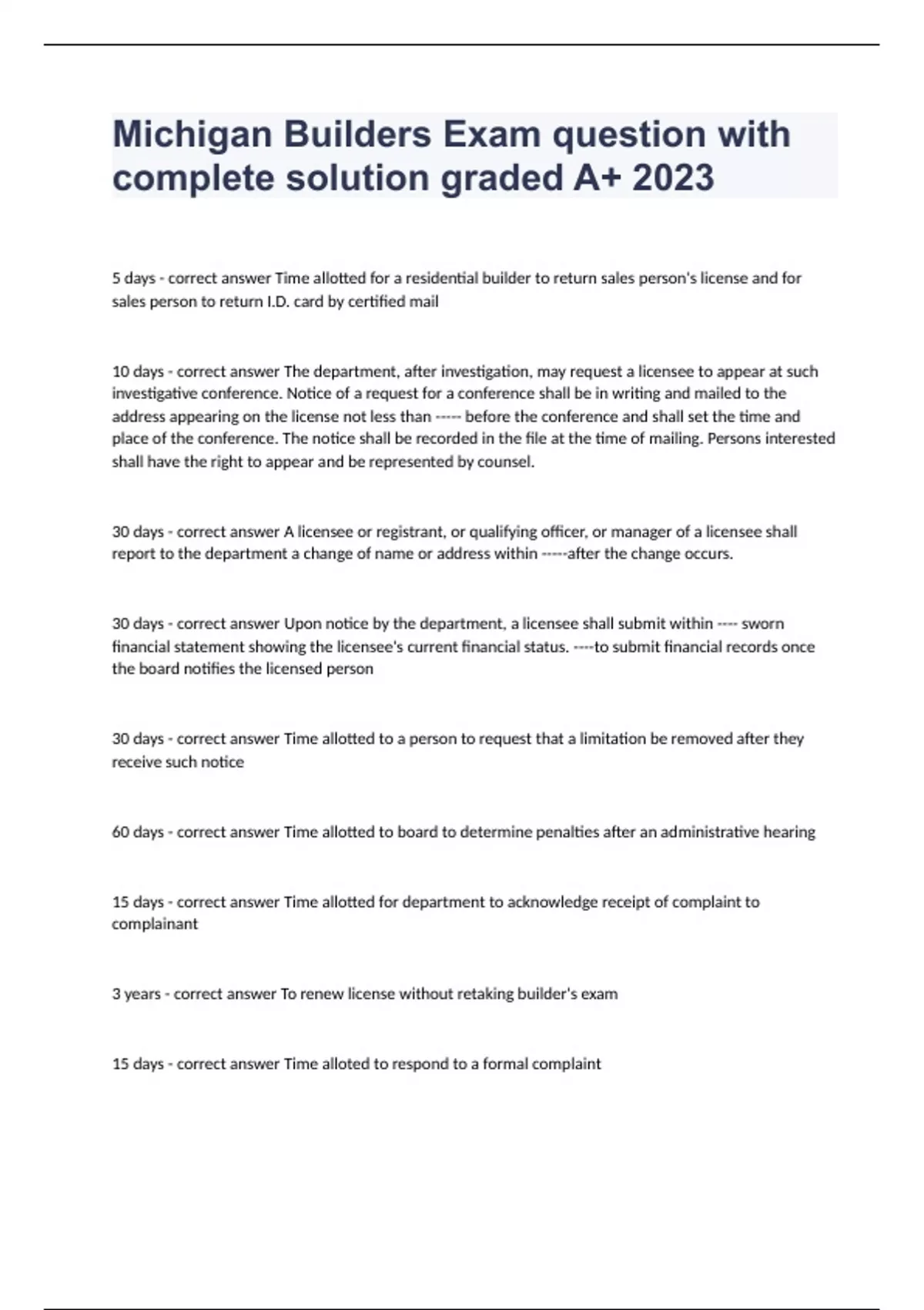 Michigan Builders Exam question with complete solution graded A+ 20235 days - correct answer Time allotted for a residential builder to return sales person's license and for sales person to return I.D. card by certified mail 10 days - correct answer The department, after investigation, may request a licensee to appear at such investigative conference. Notice of a request for a conference shall be in writing and mailed to the address appearing on the license not less than ----- before the conference and shall set the time and place of the conference. The notice shall be recorded in the file at the time of mailing. Persons interested shall have the right to appear and be represented by counsel. 30 days - correct answer A licensee or registrant, or qualifying officer, or manager of a licensee shall report to the department a change of name or address within -----after the change occurs. 30 days - correct answer Upon notice by the department, a licensee shall submit within ---- sworn financial statement showing the licensee's current financial status. ----to submit financial records once the board notifies the licensed person 30 days - correct answer Time allotted to a person to request that a limitation be removed after they receive such notice 60 days - correct answer Time allotted to board to determine penalties after an administrative hearing 15 days - correct answer Time allotted for department to acknowledge receipt of complaint to complainant 3 years - correct answer To renew license without retaking builder's exam 15 days - correct answer Time alloted to respond to a formal complaint