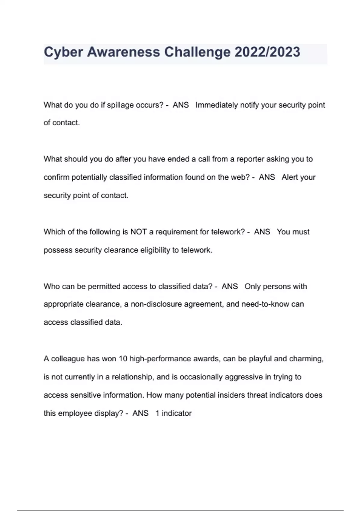 Cyber Awareness Challenge 2022/2023 QUESTIONS & ANSWERS ( A+ GRADED 100% VERIFIED)
