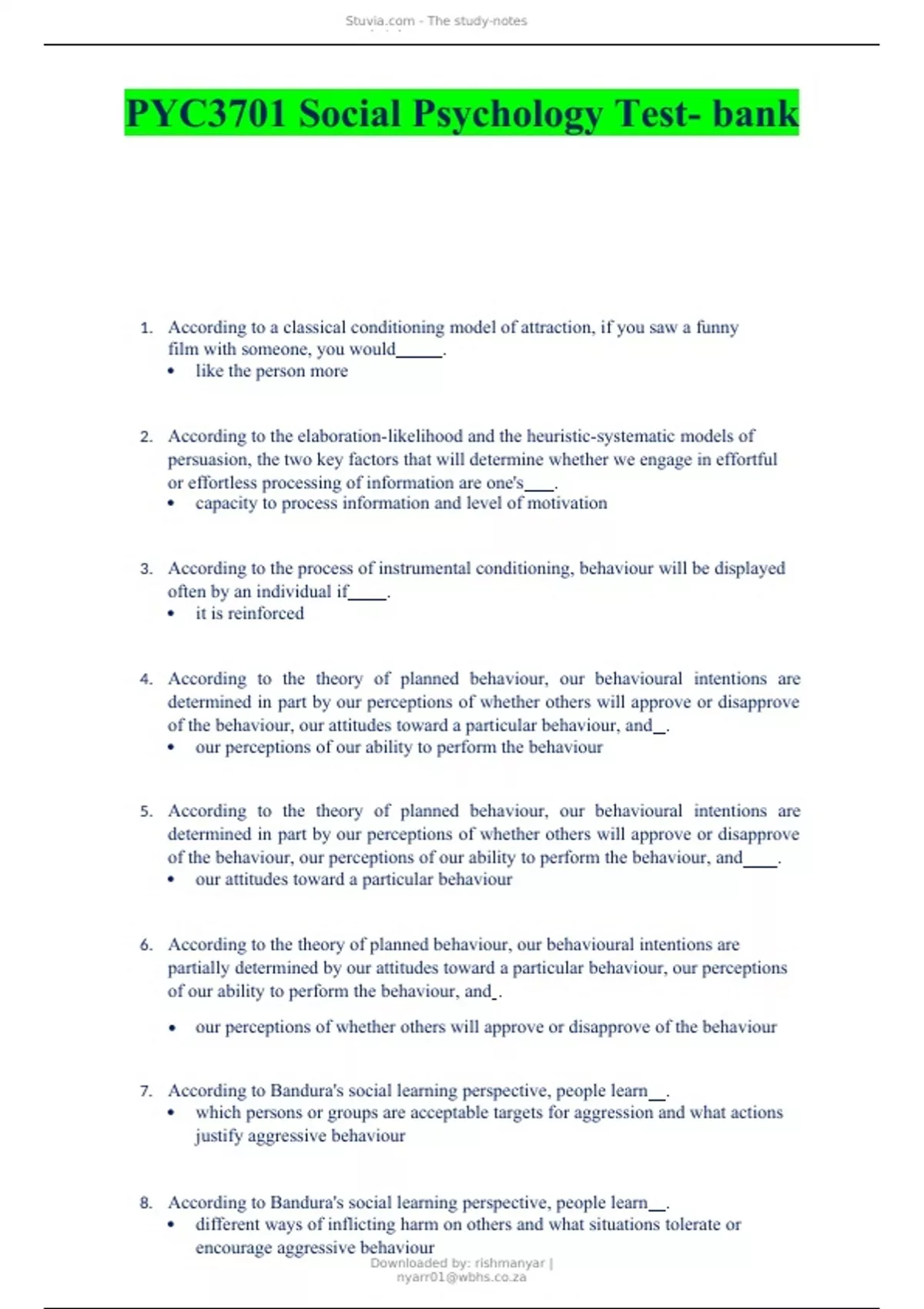 Test-bank containing 500 questions with answers for Social Psychology PYC3701