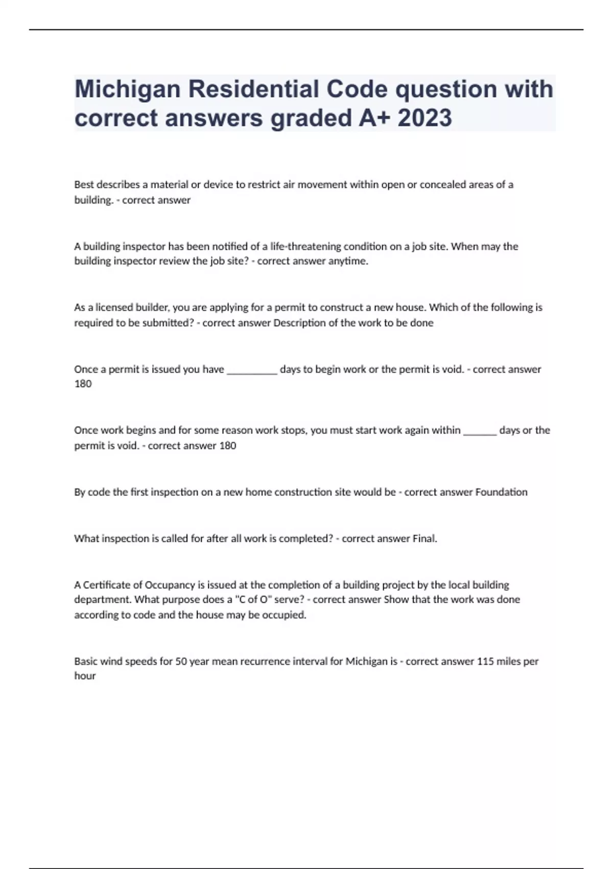 Michigan Residential Code question with correct answers graded A+ 2023Best describes a material or device to restrict air movement within open or concealed areas of a building. - correct answer A building inspector has been notified of a life-threatening condition on a job site. When may the building inspector review the job site? - correct answer anytime. As a licensed builder, you are applying for a permit to construct a new house. Which of the following is required to be submitted? - correct answer Description of the work to be done Once a permit is issued you have _________ days to begin work or the permit is void. - correct answer 180 Once work begins and for some reason work stops, you must start work again within ______ days or the permit is void. - correct answer 180 By code the first inspection on a new home construction site would be - correct answer Foundation What inspection is called for after all work is completed? - correct answer Final. A Certificate of Occupancy is issued at the completion of a building project by the local building department. What purpose does a "C of O" serve? - correct answer Show that the work was done according to code and the house may be occupied. Basic wind speeds for 50 year mean recurrence interval for Michigan is - correct answer 115 miles per hour