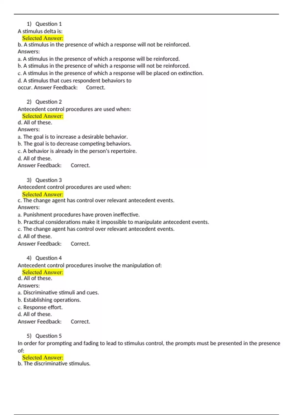 PSY 7713 Quiz 1 Unit 4 (Behaviour Analytic Interventions) 1) Question 1 A stimulus delta is: b. A stimulus in the presence of which a response will not be reinforced. Answers: a. A stimulus in the presence of which a response will be reinforced. b. A stimulus in the presence of which a response will not be reinforced. c. A stimulus in the presence of which a response will be placed on extinction. d. A stimulus that cues respondent behaviors to occur. Answer Feedback: Correct. 2) Question 2 Antecedent control procedures are used when: d. All of these. Answers: a. The goal is to increase a desirable behavior. b. The goal is to decrease competing behaviors. c. A behavior is already in the person's repertoire. d. All of these. Answer Feedback: Correct. 3) Question 3 Antecedent control procedures are used when: c. The change agent has control over relevant antecedent events. Answers: a. Punishment procedures have proven ineffective. b. Practical considerations make it impossible to manipulate antecedent events. c. The change agent has control over relevant antecedent events. d. All of these. Answer Feedback: Correct. 4) Question 4 Antecedent control procedures involve the manipulation of: d. All of these. Answers: a. Discriminative stimuli and cues. b. Establishing operations. c. Response effort. d. All of these. Answer Feedback: Correct.