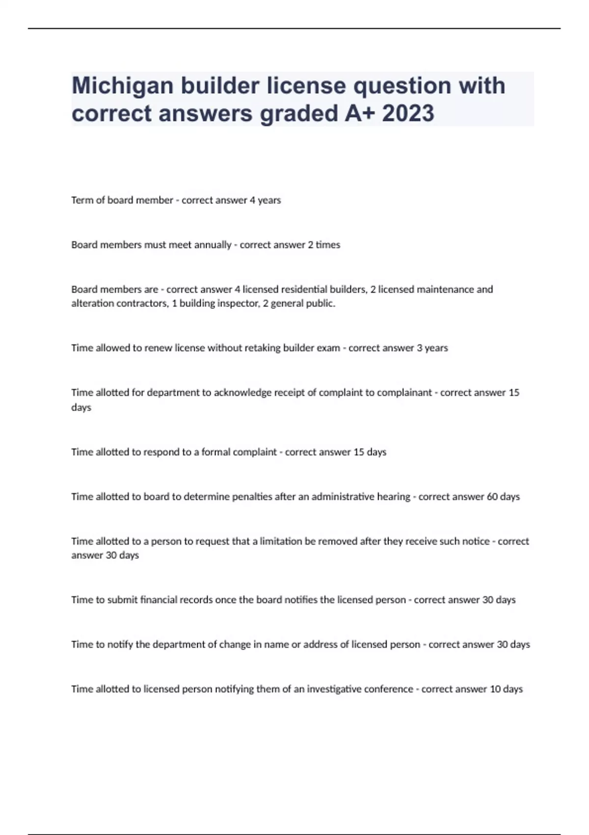 Michigan builder license question with correct answers graded A+ 2023 Term of board member - correct answer 4 years Board members must meet annually - correct answer 2 times Board members are - correct answer 4 licensed residential builders, 2 licensed maintenance and alteration contractors, 1 building inspector, 2 general public. Time allowed to renew license without retaking builder exam - correct answer 3 years Time allotted for department to acknowledge receipt of complaint to complainant - correct answer 15 days Time allotted to respond to a formal complaint - correct answer 15 days Time allotted to board to determine penalties after an administrative hearing - correct answer 60 days Time allotted to a person to request that a limitation be removed after they receive such notice - correct answer 30 days Time to submit financial records once the board notifies the licensed person - correct answer 30 days Time to notify the department of change in name or address of licensed person - correct answer 30 days Time allotted to licensed person notifying them of an investigative conference - correct answer 10 days