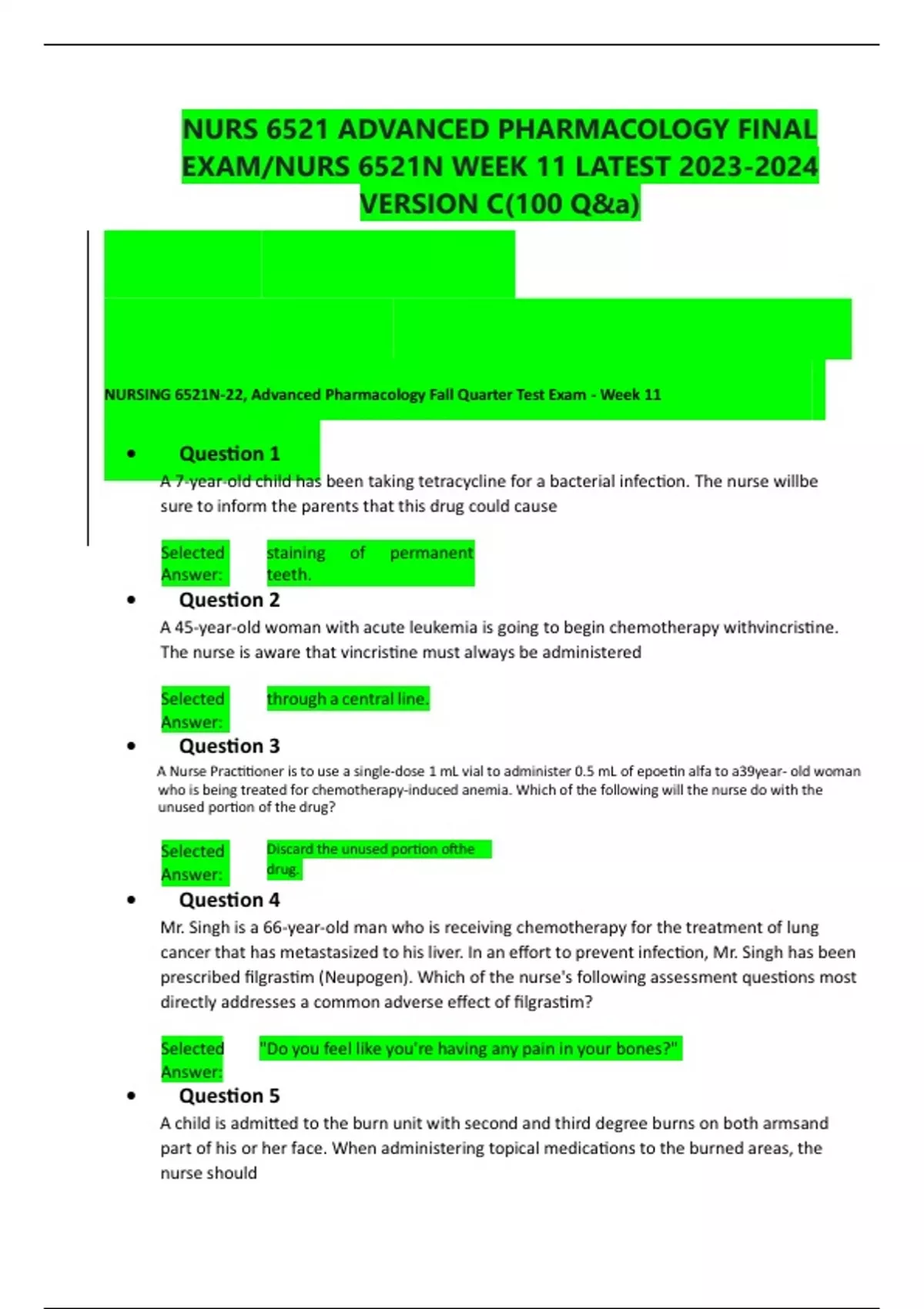 NURS 6521 ADVANCED PHARMACOLOGY FINAL EXAM/NURS 6521N WEEK 11 LATEST VERSION A(100 Q)
