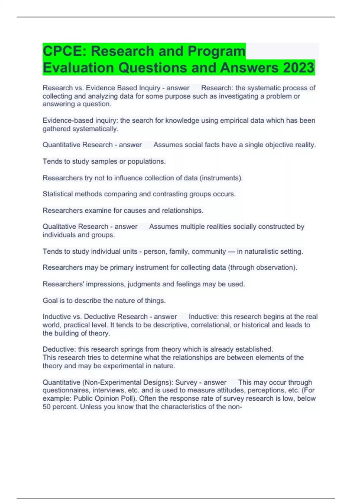 CPCE: Research and Program Evaluation Questions and Answers 2023 Research vs. Evidence Based Inquiry Research: the systematic process of collecting and analyzing data for some purpose such as investigating a problem or answering a question. Evidence-based inquiry: the search for knowledge using empirical data which has been gathered systematically. Quantitative Research Assumes social facts have a single objective reality. Tends to study samples or populations. Researchers try not to influence collection of data (instruments). Statistical methods comparing and contrasting groups occurs. Researchers examine for causes and relationships. Qualitative Research Assumes multiple realities socially constructed by individuals and groups. Tends to study individual units - person, family, community — in naturalistic setting. Researchers may be primary instrument for collecting data (through observation). Researchers' impressions, judgments and feelings may be used. Goal is to describe the nature of things. Inductive vs. Deductive Research Inductive: this research begins at the real world, practical level. It tends to be descriptive, correlational, or historical and leads to the building of theory. Deductive: this research springs from theory which is already established. This research tries to determine what the relationships are between elements of the theory and may be experimental in nature. Quantitative (Non-Experimental Designs): Survey This may occur through questionnaires, interviews, etc. and is used to measure attitudes, perceptions, etc. (For example: Public Opinion Poll). Often the response rate of survey research is low, below 50 percent. Unless you know that the characteristics of the non- respondents are similar to the characteristics of the respondents, you must be cautious in generalizing. Quantitative (Non-Experimental Designs): Descriptive Descriptive: this research simply describes an existing state of events. Numbers may be used to characterize groups or individuals. Quantitative (Non-Experimental Designs): Comparative This research method investigates whether there are differences between two or more groups. There is no manipulation of conditions experienced by each group. Quantitative (Non-Experimental Designs): Correlational This research method uses the correlation coefficient to determine the degree of relationship between two or more variables or phenomena. Quantitative (Non-Experimental Designs): Ex Post Facto Also called causal-comparative, this research design studies possible causal relationships among variables ex post facto (after the fact). You do not manipulate any variables; the focus is on what has already happened (after the fact). You may generate 'several' reasons (causes) for the relationships you discover. For example: Two employment agencies conduct job dubs. In one agency, the job clubs are member-initiated and run whereas in the other, employment counselors provide instruction and guidance. In examining the job placement rates of members for the past year, you find that the members of the professionally led groups had a higher placement rate. Typical statistics used in ex post facto research are the t -test and analysis of variance, Quantitative (Experimental Designs): True Experiment This research is characterized by the use of experimental and control groups with random assignment to each. Experimental designs are used to determine cause-and-effect relationships. For experiments, there are design variations such as: a. Treatment and control group with posttest only. b. Treatment and control group with pretest and posttest. c. Two different treatment groups with control group and posttest, and many other combinations. For example: Sixty college freshmen are enrolled in an English class. Thirty are randomly assigned to a one-hour per week writing lab, the others comprise a control group. End-of-semester essay examination results are analyzed to see if the lab was associated with better writing skills. Quantitative (Experimental Designs): Quasi-Experiment This research is similar to experimental research except that randomization of subjects to treatment and control groups is not possible. It may be that no control or comparison group is available. Results from such research will not be as unequivocal as results from a true experimental study. For example: An elementary school has two classrooms of fourth graders. Each classroom of fourth graders is taught arithmetic by a different method for the school year. In May, arithmetic achievement is compared for the two classrooms using scores on a national exam. There was no random assignment of students to the two classrooms and the 'arithmetic teaching methods' were not randomly assigned to the two classes. Qualitative Research: Interactive i. Case study in which the case may be a program, activity, or a set of individuals who are bounded in time and place. ii. Ethnography which is a description and interpretation of a cultural or social group or system. Data is typically collected through observation and interviewing. The issue of observer bias is important. Qualitative Research: Noninteractive This is analytical research conducted primarily through document analysis. Examples might be historical analysis (collecting and analyzing documents describing former events), biographical analysis (written or oral) and legal analysis which focuses on law and court decisions. Mixed-Methods Research Design These designs combine quantitative and qualitative methods in the same research effort. The researcher retains the flexibility to use both types of designs. Typically, the designs are used sequentially. For example, quantitative may be gathered first and then qualitative methods are used to further explain or elaborate on the findings, using perhaps, surveys, interviews, or focus groups. Single-Subject Design Studies the effects of a program or treatment on an individual or group treated as an individual, usually a