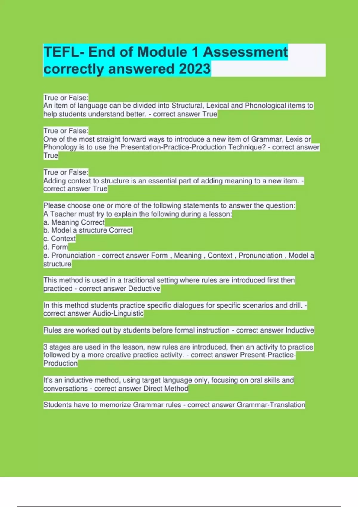 TEFL- End of Module 1 Assessment correctly answered 2023