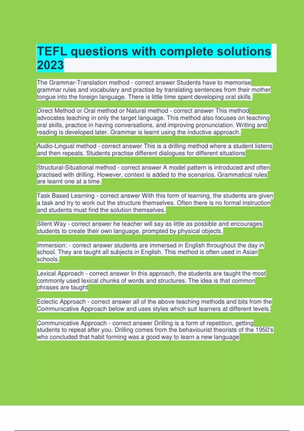 The Grammar-Translation method - correct answer Students have to memorise grammar rules and vocabulary and practise by translating sentences from their mother tongue into the foreign language. There is little time spent developing oral skills. Direct Method or Oral method or Natural method - correct answer This method advocates teaching in only the target language. This method also focuses on teaching oral skills, practice in having conversations, and improving pronunciation. Writing and reading is developed later. Grammar is learnt using the inductive approach. Audio-Lingual method - correct answer This is a drilling method where a student listens and then repeats. Students practise different dialogues for different situations Structural-Situational method - correct answer A model pattern is introduced and often practised with drilling. However, context is added to the scenarios. Grammatical rules are learnt one at a time. Task Based Learning - correct answer With this form of learning, the students are given a task and try to work out the structure themselves. Often there is no formal instruction and students must find the solution themselves. Silent Way - correct answer he teacher will say as little as possible and encourages students to create their own language, prompted by physical objects. Immersion: - correct answer students are immersed in English throughout the day in school. They are taught all subjects in English. This method is often used in Asian schools. Lexical Approach - correct answer In this approach, the students are taught the most commonly used lexical chunks of words and structures. The idea is that common phrases are taught Eclectic Approach - correct answer all of the above teaching methods and bits from the Communicative Approach below and uses styles which suit learners at different levels. Communicative Approach - correct answer Drilling is a form of repetition, getting students to repeat after you. Drilling comes from the behaviourist theorists of the 1950's who concluded that habit forming was a good way to learn a new language
