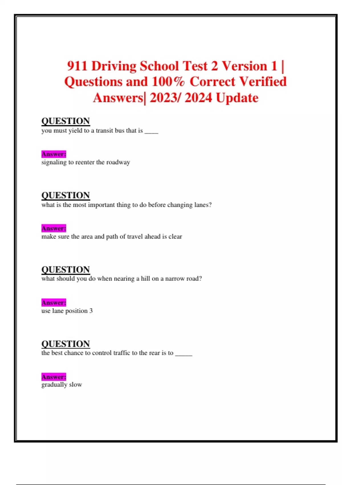 911 Driving School Test 2 Version 1 | Questions and 100% Correct Verified Answers| 2023/ 2024 Update QUESTION you must yield to a transit bus that is ____ Answer: signaling to reenter the roadway QUESTION what is the most important thing to do before changing lanes? Answer: make sure the area and path of travel ahead is clear QUESTION what should you do when nearing a hill on a narrow road? Answer: use lane position 3 QUESTION the best chance to control traffic to the rear is to _____ Answer: gradually slow QUESTION when must you signal a turn? Answer: within 100 feet of a turn QUESTION maintaining a space cushion is a way of ____ Answer: of driving defensively QUESTION what does driving with your lights on do? Answer: makes it easier for other to see you QUESTION what is the best lane position to drive in on a two-way two-lane road with parked cars is? Answer: lane position two QUESTION what happens when roads become bumpy? Answer: traction decreases