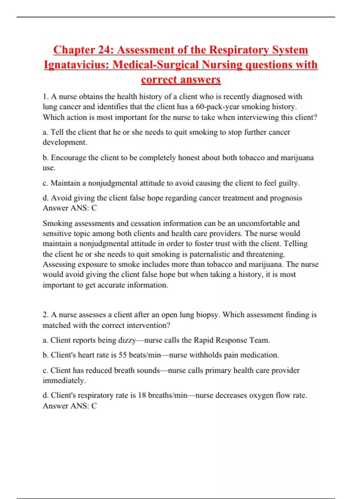 1. A nurse obtains the health history of a client who is recently diagnosed with lung cancer and identifies that the client has a 60-pack-year smoking history. Which action is most important for the nurse to take when interviewing this client? a. Tell the client that he or she needs to quit smoking to stop further cancer development. b. Encourage the client to be completely honest about both tobacco and marijuana use. c. Maintain a nonjudgmental attitude to avoid causing the client to feel guilty. d. Avoid giving the client false hope regarding cancer treatment and prognosis Answer ANS: C Smoking assessments and cessation information can be an uncomfortable and sensitive topic among both clients and health care providers. The nurse would maintain a nonjudgmental attitude in order to foster trust with the client. Telling the client he or she needs to quit smoking is paternalistic and threatening. Assessing exposure to smoke includes more than tobacco and marijuana. The nurse would avoid giving the client false hope but when taking a history, it is most important to get accurate information. 2. A nurse assesses a client after an open lung biopsy. Which assessment finding is matched with the correct intervention? a. Client reports being dizzy—nurse calls the Rapid Response Team. b. Client's heart rate is 55 beats/min—nurse withholds pain medication. c. Client has reduced breath sounds—nurse calls primary health care provider immediately. d. Client's respiratory rate is 18 breaths/min—nurse decreases oxygen flow rate. Answer ANS: C