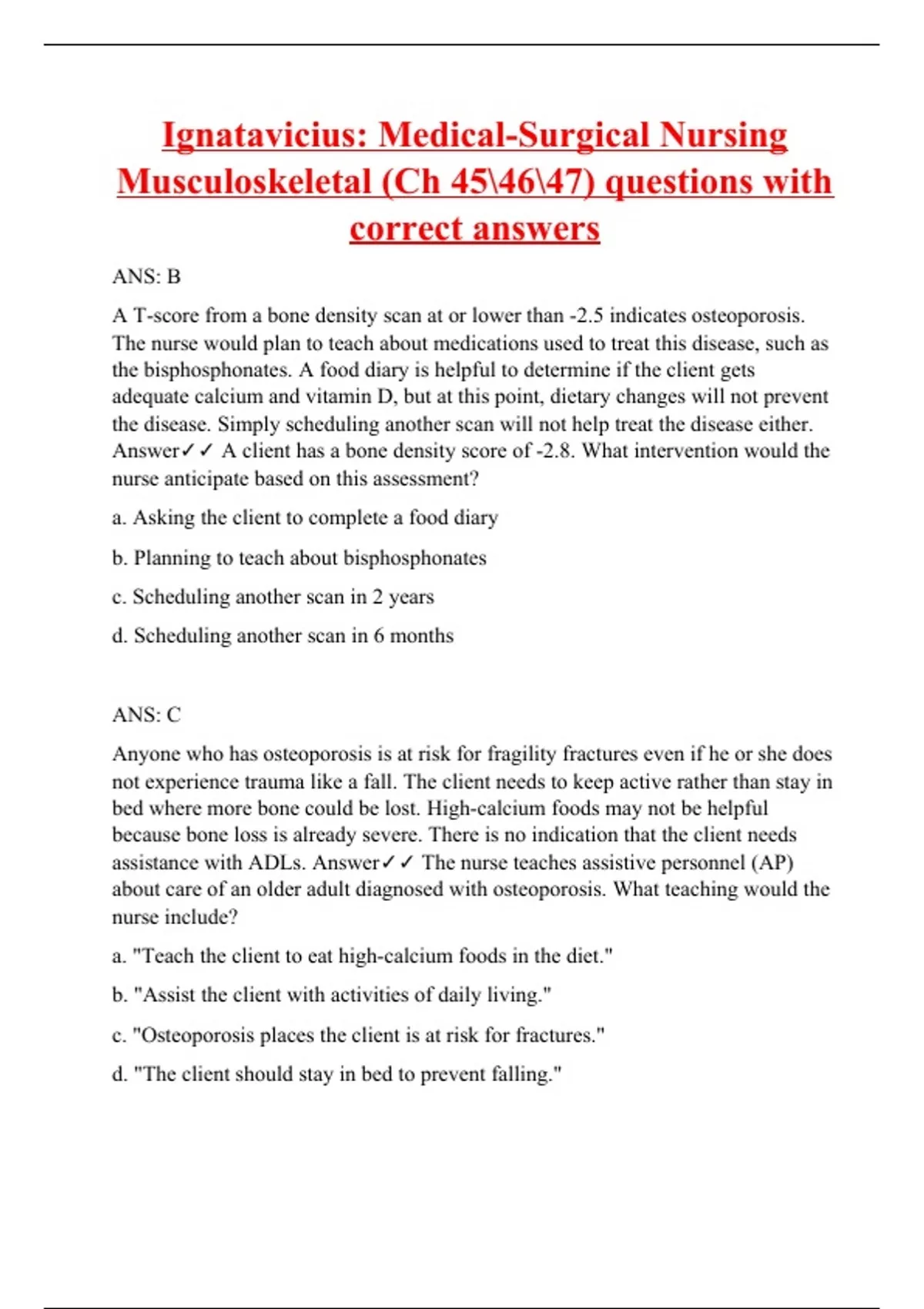 ANS: B A T-score from a bone density scan at or lower than -2.5 indicates osteoporosis. The nurse would plan to teach about medications used to treat this disease, such as the bisphosphonates. A food diary is helpful to determine if the client gets adequate calcium and vitamin D, but at this point, dietary changes will not prevent the disease. Simply scheduling another scan will not help treat the disease either. Answer A client has a bone density score of -2.8. What intervention would the nurse anticipate based on this assessment? a. Asking the client to complete a food diary b. Planning to teach about bisphosphonates c. Scheduling another scan in 2 years d. Scheduling another scan in 6 months ANS: C Anyone who has osteoporosis is at risk for fragility fractures even if he or she does not experience trauma like a fall. The client needs to keep active rather than stay in bed where more bone could be lost. High-calcium foods may not be helpful because bone loss is already severe. There is no indication that the client needs assistance with ADLs. Answer The nurse teaches assistive personnel (AP) about care of an older adult diagnosed with osteoporosis. What teaching would the nurse include? a. "Teach the client to eat high-calcium foods in the diet." b. "Assist the client with activities of daily living." c. "Osteoporosis places the client is at risk for fractures." d. "The client should stay in bed to prevent fal