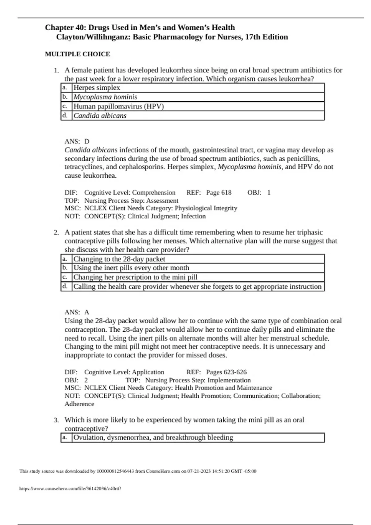 2. A patient states that she has a difficult time remembering when to resume her triphasic contraceptive pills following her menses. Which alternative plan will the nurse suggest that she discuss with her health care provider? a. Changing to the 28-day packet b. Using the inert pills every other month c. Changing her prescription to the mini pill d. Calling the health care provider whenever she forgets to get appropriate instruction ANS: A Using the 28-day packet would allow her to continue with the same type of combination oral contraception. The 28-day packet would allow her to continue daily pills and eliminate the need to recall. Using the inert pills on alternate months will alter her menstrual schedule. Changing to the mini pill might not meet her contraceptive needs. It is unnecessary and inappropriate to contact the provider for missed doses. DIF: Cognitive Level: Application REF: Pages 623-626 OBJ: 2 TOP: Nursing Process Step: Implementation MSC: NCLEX Client Needs Category: Health Promotion and Maintenance NOT: CONCEPT(S): Clinical Judgment; Health Promotion; Communication; Collaboration; Adherence 3. Which is more likely to be experienced by women taking the mini pill as an oral contraceptive? a. Ovulation, dysmenorrhea, and breakthrough bleeding This study source was downloaded by from CourseH on 07-21-2023 14:51:20 GMT -05:00 b. Excessive weight gain and breast tenderness c. Increased estrogen-related adverse effects d. Difficulty breastfeeding after pregnancy ANS: A The mini pill is made up of progestin, which inhibits ovulation. This form of contraception is an alternative for women particularly susceptible to adverse effects caused by estrogen therapy. Between 30% and 40% of women continue to ovulate with this form of contraception, however, and there is a slightly higher incidence of uterine and tubal pregnancies. Dysmenorrhea, manifested by irregular or infrequent menses and spotting between cycles, is common in women taking the mini pill. The mini pill has a reduced chance for weight gain and breast tenderness, does not contain estrogen, and does not cause difficulty with breastfeeding. DIF: Cognitive Level: Comprehension REF: Page 625 OBJ: 2 TOP: Nursing Process Step: Evaluation MSC: NCLEX Client Needs Category: Health Promotion and Maintenance NOT: CONCEPT(S): Clinical Judgment 4. The nurse is obtaining a history on a patient who is seeking oral contraceptives. Which condition would contraindicate the use of oral contrace