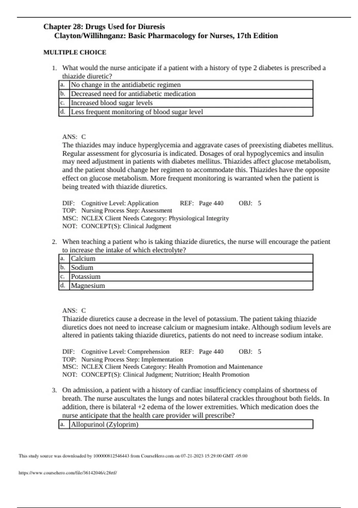 5. How soon will diuresis be expected to occur after the nurse has administered 20 mg of furosemide (Lasix) intravenously (IV) to a patient with heart failure? a. As soon as injected b. Within 10 minutes c. After 2 hours d. After 4 hours ANS: B The onset of diuresis following IV furosemide administration is 5 to 10 minutes after administration. The diuretic effect peaks within 30 minutes and lasts approximately 2 hours. DIF: Cognitive Level: Comprehension REF: Page 436 OBJ: 5 TOP: Nursing Process Step: Assessment MSC: NCLEX Client Needs Category: Physiological Integrity This study source was downloaded by from CourseH on :29:00 GMT -05:00 NOT: CONCEPT(S): Clinical Judgment; Elimination 6. Which foods will the nurse recommend for a patient taking loop diuretics? a. Protein-rich foods such as poultry, whole grains, and fish b. Fiber-rich foods such as yellow vegetables, nuts, and lentils c. Potassium-rich foods such as raisins, figs, and bananas d. Sodium-rich foods such as canned vegetables and processed foods ANS: C Loop diuretics deplete potassium. Potassium-rich foods include raisins, figs, bananas, peaches, kiwis, dates, apricots, oranges, prunes, melons, broccoli, and potatoes. Protein- and fiber-rich foods are not needed in increased amounts by patients taking loop diuretics. Because of high sodium content, canned foods are restricted for patients on diuretic therapy. DIF: Cognitive Level: Analysis REF: Page 437 OBJ: 5 TOP: Nursing Process Step: Planning MSC: NCLEX Client Needs Category: Health Promotion and Maintenance NOT: CONCEPT(S): Clini