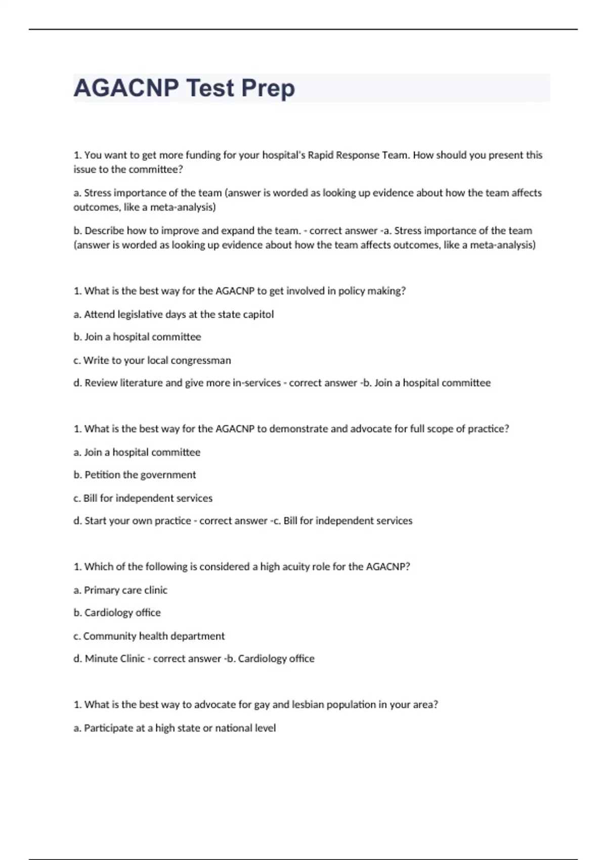 1. You want to get more funding for your hospital’s Rapid Response Team. How should you present this issue to the committee? a. Stress importance of the team (answer is worded as looking up evidence about how the team affects outcomes, like a meta-analysis) b. Describe how to improve and expand the team. a. Stress importance of the team (answer is worded as looking up evidence about how the team affects outcomes, like a meta-analysis) 1. What is the best way for the AGACNP to get involved in policy making? a. Attend legislative days at the state capitol b. Join a hospital committee c. Write to your local congressman d. Review literature and give more in-services b. Join a hospital committee 1. What is the best way for the AGACNP to demonstrate and advocate for full scope of practice? a. Join a hospital committee b. Petition the government c. Bill for independent services d. Start your own practice c. Bill for independent services 1. Which of the following is considered a high acuity role for the AGACNP? a. Primary care clinic b. Cardiology office c. Community health department d. Minute Clinic b. Cardiology office 1. What is the best way to advocate for gay and lesbian population in your area? a. Participate at a high state or national level b. Join a non-profit advocacy group c. Consider lobbying the government d. Start at your facility (answers are worded differently. One of them is “decrease bias in healthcare” and another is something like “create inservices in healthcare” and another is “obtain funding to increase access.” d. Start at your facility 1. Which of the following is most important to evaluate statistical significance when reviewing the literature? a. Consider the sample size b. Make sure the confidence interval is tight c. See if the p-value is less than the α-coefficient d. Determine the error rate (Answers are worded differently. “Ensure confounding variables were eliminated” & “P value is less than null hypothesis” were two of them. a. Consider the sample size
