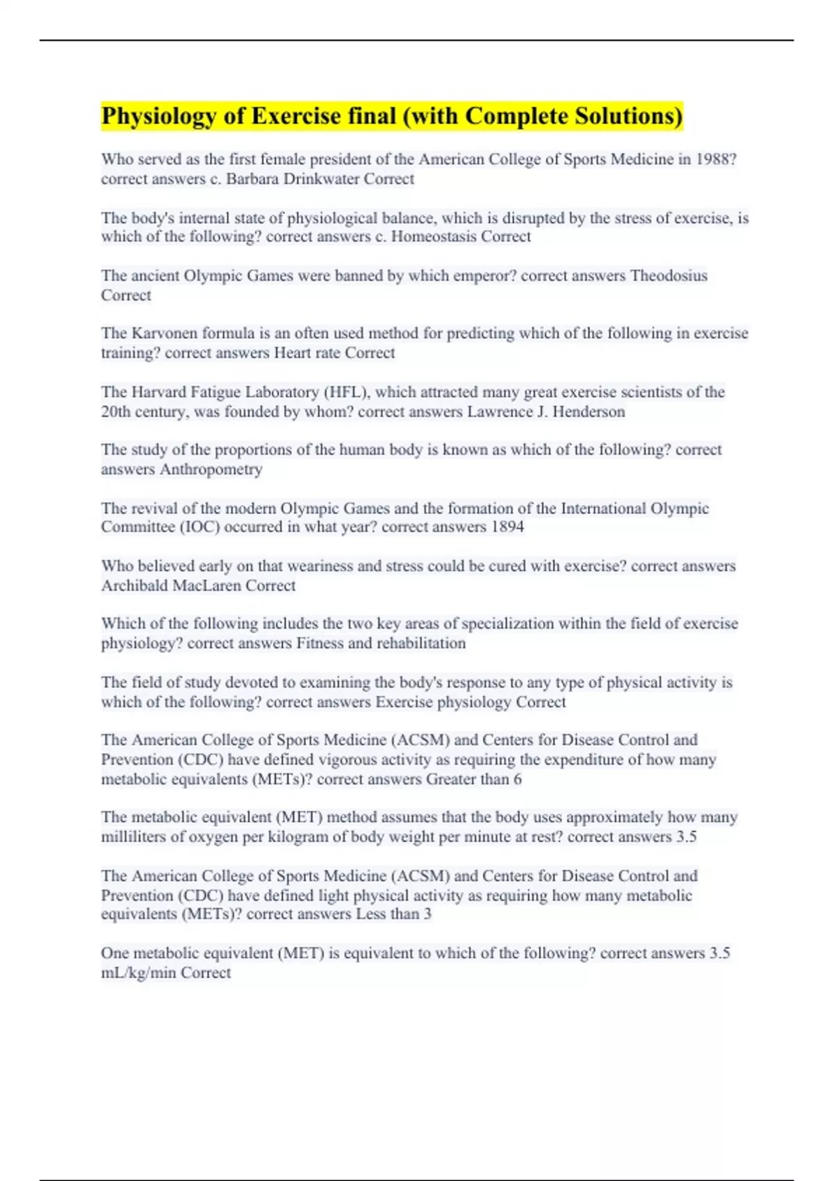 Who served as the first female president of the American College of Sports Medicine in 1988? correct answers c. Barbara Drinkwater Correct The body's internal state of physiological balance, which is disrupted by the stress of exercise, is which of the following? correct answers c. Homeostasis Correct The ancient Olympic Games were banned by which emperor? correct answers Theodosius Correct The Karvonen formula is an often used method for predicting which of the following in exercise training? correct answers Heart rate Correct The Harvard Fatigue Laboratory (HFL), which attracted many great exercise scientists of the 20th century, was founded by whom? correct answers Lawrence J. Henderson The study of the proportions of the human body is known as which of the following? correct answers Anthropometry The revival of the modern Olympic Games and the formation of the International Olympic Committee (IOC) occurred in what year? correct answers 1894 Who believed early on that weariness and stress could be cured with exercise? correct answers Archibald MacLaren Correct Which of the following includes the two key areas of specialization within the field of exercise physiology? correct answers Fitness and rehabilitation The field of study devoted to examining the body's response to any type of physical activity is which of the following? correct answers Exercise physiology Correct The American College of Sports Medicine (ACSM) and Centers for Disease Control and Prevention (CDC) have defined vigorous activity as requiring the expenditure of how many metabolic equivalents (METs)? correct answers Greater than 6 The metabolic equivalent (MET) method assumes that the body uses approximately how many milliliters of oxygen per kilogram of body weight per minute at rest? correct answers 3.5 The American College of Sports Medicine (ACSM) and Centers for Disease Control and Prevention (CDC) have defined light physical activity as requiring how many metabolic equivalents (METs)? correct answers Less than 3 One metabolic equivalent (MET) is equivalent to which of the following? correct answers 3.5 mL/kg/min Correct