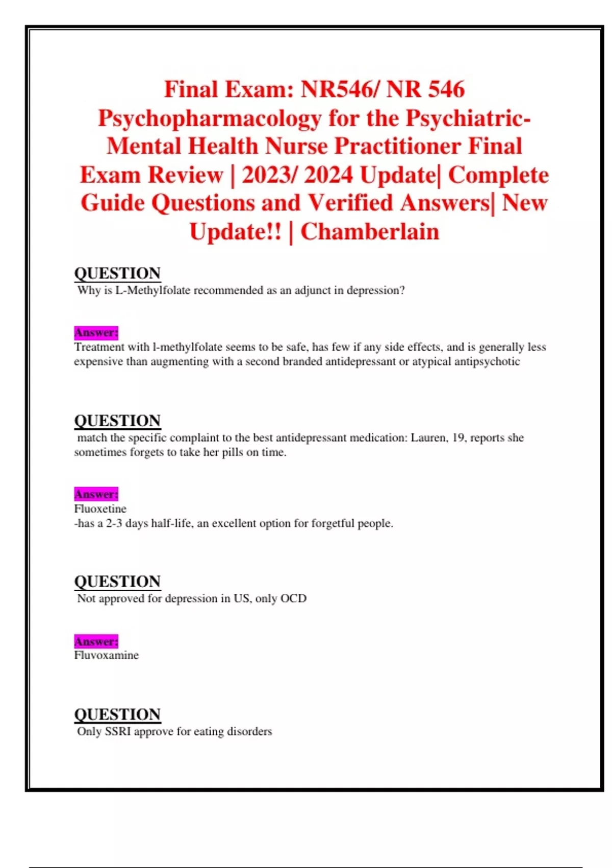 Final Exam: NR546/ NR 546 Psychopharmacology for the Psychiatric- Mental Health Nurse Practitioner Final Exam Review | Complete Guide Questions and Verified Answers| 2023/ 2024!! |Chamberlain QUESTION Paroxetine warning Answer: this antidepressant has the highest risk of discontinuation syndrome d/t serotonin transporter inhibition and anticholinergic rebound. If treatment course has lasted 8 weeks, discontinue over 1-2 weeks. QUESTION serotonin syndrome Answer: With any drug that increases 5HT (e.g., MAO inhibitors, SNRIs, TCAs) hyperthermia, confusion, myoclonus, cardiovascular instability, flushing, diarrhea, seizures. QUESTION serotonin syndrome treatment Answer: Cyproheptadine (5HT-2 receptor antagonist) QUESTION Paroxetine is contraindicated in Answer: antidepressant with risk of congenital defects including atrial septal defects QUESTION SNRI's Answer: breastfeeding infants should be monitored for irritability when mom is taking this type of antidepressant QUESTION citalopram and escitalopram Answer: antidepressant should be dosed at 1/2 because of risk for QT prolongation in older adults QUESTION history of falls/fracture Answer: older adults should not take paroxetine if they have a history of QUESTION TCA's Answer: older adults should avoid these antidepressants if they are prescribed other CNS depressants. QUESTION Children and young adults Answer: antidepressants increase the risk of suicide in this age group QUESTION Best tolerated SSRI Answer: Escitalopram (Lexapro) QUESTION medication classes used for BPD Answer: mood stabilizers, anticonvulsants, and atypical antipsychotics. QUESTION Lithium MOA Answer: this medication alters cation transport in the nerve and muscle QUESTION Lithium indications Answer: medication used to treat euphoric mania, rapid cycling, and for maintenance therapy. QUESTION Lithium adverse effects Answer: GI effects, polyuria, and tremor. QUESTION Lithium PEARLS Answer: Monitor plasma levels. Reduce dose by 50% in clients with renal failure. Use caution with concurrent diuretics. Can be used to protect against suicide. Levels can be increased by NSAIDs and ACE inhibitors. Levels can be decreased by caffeine and mania. QUESTION