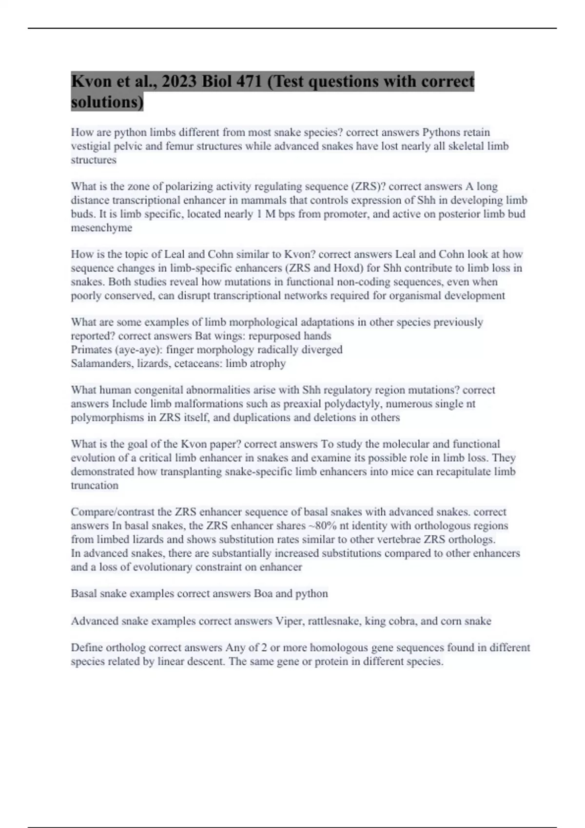 Kvon et al., 2023 Biol 471 (Test questions with correct solutions)