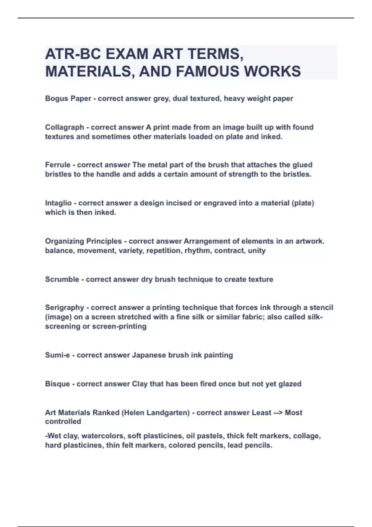 ATR-BC EXAM ART TERMS, MATERIALS, AND FAMOUS WORKS|UPDATED&VERIFIED|100% SOLVED|GUARANTEED SUCCESS