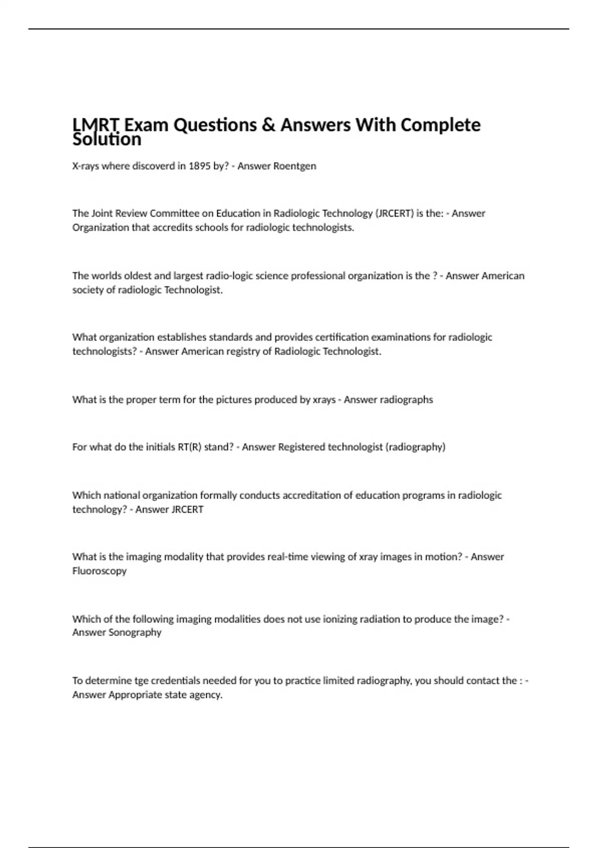 X-rays where discoverd in 1895 by? - Answer Roentgen The Joint Review Committee on Education in Radiologic Technology (JRCERT) is the: - Answer Organization that accredits schools for radiologic technologists. The worlds oldest and largest radio-logic science professional organization is the ? - Answer American society of radiologic Technologist. What organization establishes standards and provides certification examinations for radiologic technologists? - Answer American registry of Radiologic Technologist. What is the proper term for the pictures produced by xrays - Answer radiographs For what do the initials RT(R) stand? - Answer Registered technologist (radiography) Which national organization formally conducts accreditation of education programs in radiologic technology? - Answer JRCERT What is the imaging modality that provides real-time viewing of xray images in motion? - Answer Fluoroscopy Which of the following imaging modalities does not use ionizing radiation to produce the image? - Answer Sonography To determine tge credentials needed for you to practice limited radiography, you should contact the : - Answer Appropriate state agency. Limited radiography is called limited because the - Answer scope of practice is limited Which of the following are within the scope o practice for a limited operator? - Answer Basic radiographic examination and Explanation of procedure The imaging modality that uses contrast media to immage blood vessels is called: - Answer Angiography Which of the following are possible consequences for practicing beyond the scope of practice of a limited operator? - Answer Monetary Fines , Revocation of license /permit , Imprisonment The term reciprocity means that : - Answer Credentials issued in one area are recognized in another Which of the following qualifies as practicing beyond the scope of a limited operator? - Answer Performing mammography's in a private physician's office. A term for a physician who has completed extensive additional training to qualify as an expert in a particular aspect of practice is a : - Answer Specialist A specialist who interprets radiographs and performs special imaging procedures is called a: - Answer Radiologist X ray examinations are performed on orders issued by : - Answer Physicians Which of the following is considered a duty of a limited x-ray machine operator - Answer Explain the procedure and the preparation to the patient A medical doctor who diagnoses and treats disorders and diseases of the feet is called a : - Answer Podiatrist Xrays that are traveling in a useful direction exit via the - Answer Tube port. The portion of the xray room that is protected from scatter radiation and is safe during exposures is called the - Answer Control booth A line in the center of the xray beam and perpendicular to the long axis of the xray tube - Answer central ray A film that has been exposed but has not yet been proccessed has a pattern of exposure that is called the - Answer latent image Tissues with greater mass, such as bone, will absorb ____ radiation, as compared with less dense tissues, such as fat. - Answer More The absorption of xrays by matter is called : - Answer attenuation Which of the following statements regarding scatter radiation is true? - Answer Scatter radiation has less energy than the primary beam. The pattern of __ radiation creates the image on the film - Answer Remnant The image receptor (IR) usually consists of the - Answer Cassette and the film Which of the following common IR sizes are used for general examinations - Answer 18*24cm 24*30cm 35*43cm ALL What is the typical usage of a 24 * 24 cm IR - Answer Fluoroscopic spots Computed radiography (CR) is sometimes called a - Answer Filmless system Where is the image obtained in computed radiography (CR) - Answer In a phosphor material Computed radiography (CR) eliminates the need for - Answer Dark rooms A mechanism that tends to stop a moving part in a specific location is called a - Answer Detent The boxlike device attached under the tube housing that allows the limited operator to vary the size of the radiation field is called a ? - Answer Collimator A device to protect the film from being fogged by scatter radiation is called a(n): - Answer Grid or Bucky The principal source of scatter radiation is the : - Answer Patient A tilting table will allow the head end to be lowered at least 15 degrees into the: - Answer Trendlenburg postion The principal purpose of doing a "safety check " before making an exposure is to: - Answer Prevent accidental exposure of coworkers The IR in a radiography department can be - Answer A conventional cassette with a screen and film . The upright cassette holder ( NO PLATE) What term refers to the structure of the human body ? - Answer Anatomy Anatomy refers to the __ of the body - Answer Structure What term refers to the study of the function of the human body? - Answer Physiology Physiology pertains to the study of the __ of the human body - Answer Function The study of diseases or abnormal conditions of the body is termed - Answer Pathology Pathology is tge study of __ of the body - Answer diseases A general knowledge of __ helps limited operators understand the reasons procedures are needed. - Answer Pathology There are ___ levels of structural organizations of the human body - Answer 6 The smallest units of living things are called - Answer cells cells are defined as - Answer the smallest units of living things tissues are defined as - Answer a group of similar cells that work together to perform complex functions A group of similar cells that work together to perform a common function is called a(n) - Answer Tissue A group of tissue that work together to perform specialized and complex functions is called a(n) - Answer organ An organ is defined as - Answer A group of tissues that work together to perform specialized and complex functions