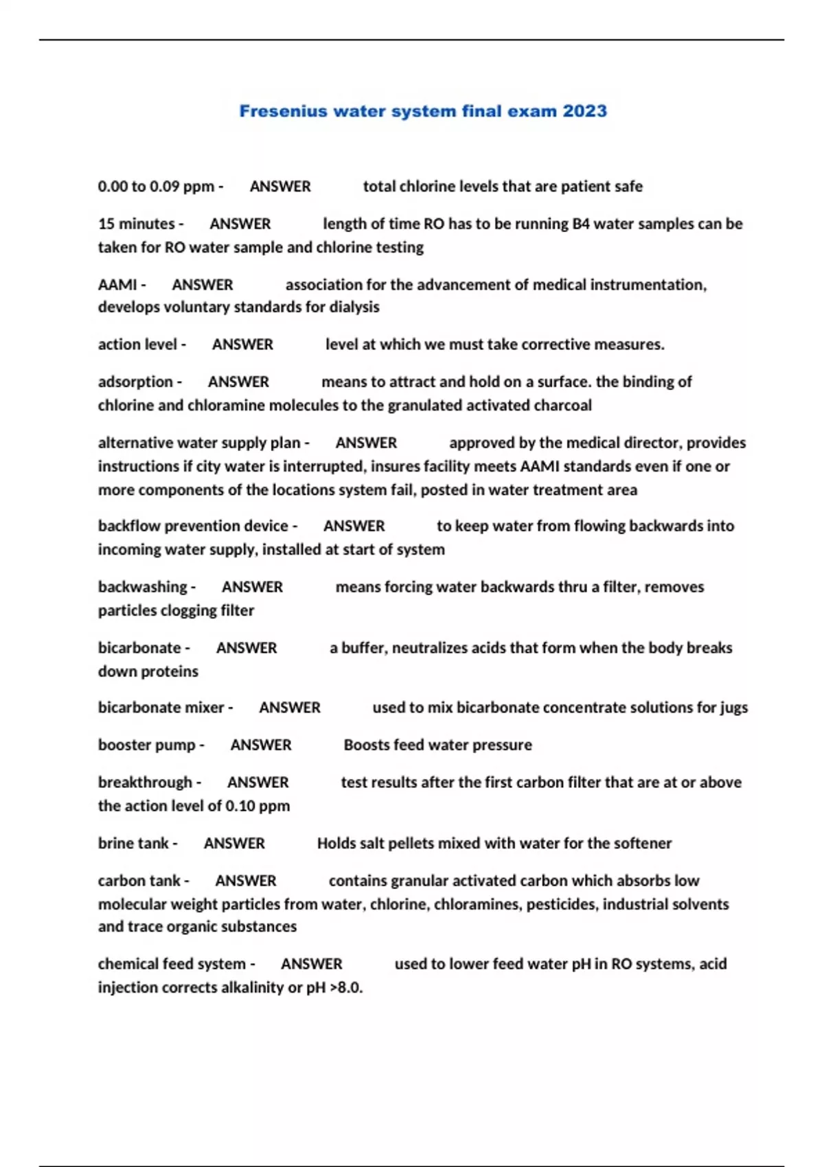 Fresenius water system final exam 2023