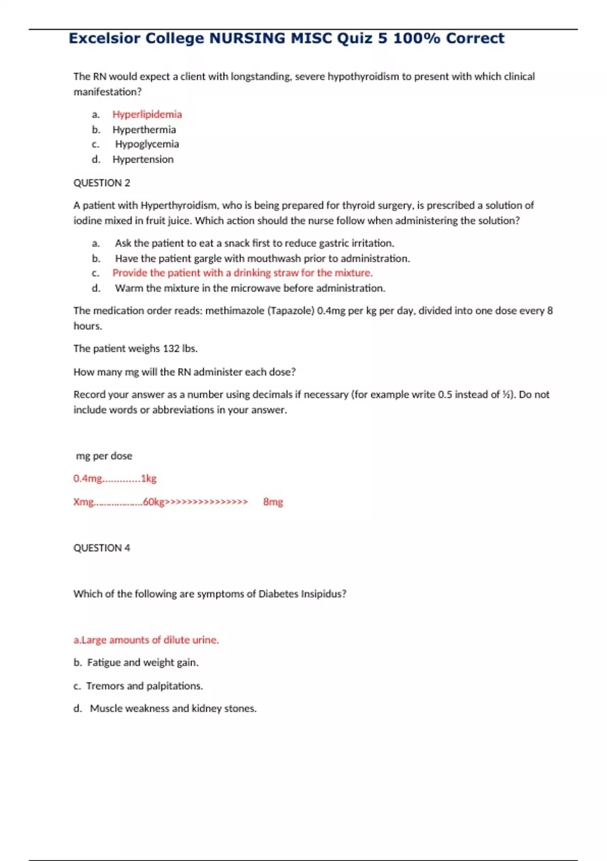 Excelsior College NURSING MISC Quiz 5 100% Correct The RN would expect a client with longstanding, severe hypothyroidism to present with which clinical manifestation? a. Hyperlipidemia b. Hyperthermia c. Hypoglycemia d. Hypertension QUESTION 2 A patient with Hyperthyroidism, who is being prepared for thyroid surgery, is prescribed a solution of iodine mixed in fruit juice. Which action should the nurse follow when administering the solution? a. Ask the patient to eat a snack first to reduce gastric irritation. b. Have the patient gargle with mouthwash prior to administration. c. Provide the patient with a drinking straw for the mixture. d. Warm the mixture in the microwave before administration. The medication order reads: methimazole (Tapazole) 0.4mg per kg per day, divided into one dose every 8 hours. The patient weighs 132 lbs.