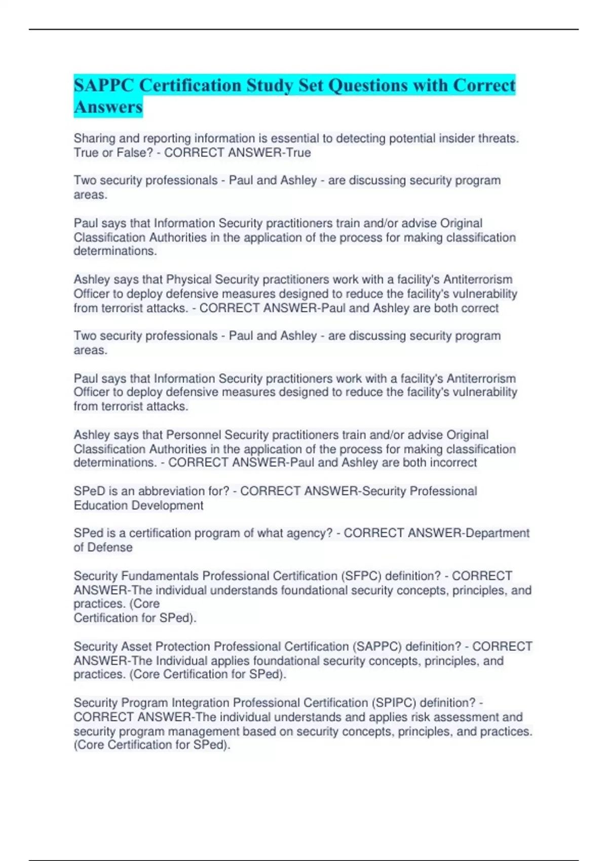 SAPPC Certification Study Set Questions with Correct Answers Sharing and reporting information is essential to detecting potential insider threats. True or False? - CORRECT ANSWER-True Two security professionals - Paul and Ashley - are discussing security program areas. Paul says that Information Security practitioners train and/or advise Original Classification Authorities in the application of the process for making classification determinations. Ashley says that Physical Security practitioners work with a facility's Antiterrorism Officer to deploy defensive measures designed to reduce the facility's vulnerability from terrorist attacks. - CORRECT ANSWER-Paul and Ashley are both correct Two security professionals - Paul and Ashley - are discussing security program areas. Paul says that Information Security practitioners work with a facility's Antiterrorism Officer to deploy defensive measures designed to reduce the facility's vulnerability from terrorist attacks. Ashley says that Personnel Security practitioners train and/or advise Original Classification Authorities in the application of the process for making classification determinations. - CORRECT ANSWER-Paul and Ashley are both incorrect SPeD is an abbreviation for? - CORRECT ANSWER-Security Professional Education Development SPed is a certification program of what agency? - CORRECT ANSWER-Department of Defense Security Fundamentals Professional Certification (SFPC) definition? - CORRECT ANSWER-The individual understands foundational security concepts, principles, and practices. (Core Certification for SPed). Security Asset Protection Professional Certification (SAPPC) definition? - CORRECT ANSWER-The Individual applies foundational security concepts, principles, and practices. (Core Certification for SPed). Security Program Integration Professional Certification (SPIPC) definition? - CORRECT ANSWER-The individual understands and applies risk assessment and security program management based on security concepts, principles, and practices. (Core Certification for SPed). Security Enterprise Professional Certification (SEPC) definition? - CORRECT ANSWER-The individual understands and applies concepts, principles, and practices for managing enterprise-wide security. What are the three principle incident/events required to be reported to DoD Counterintelligence (CI) organizations? - CORRECT ANSWER-Espionage, Sabotage, Terrorism & Cyber Policy PMO is an abbreviation for? - CORRECT ANSWER-Program Management Office Provides the legal requirements to use lawful means to ensure U. S. receives the best intelligence available? - CORRECT ANSWER-E.O. 12333 The manual that includes CI-related requirements for Industry? - CORRECT ANSWER-DoD 5220.22-M (NISPOM) Regulation mandating CI-specific training, briefing, and reporting? - CORRECT ANSWER-DoDI5240.6: CI Awareness, Briefing, and Reporting Programs Regulation providing procedures to follow when classified information is compromised? - CORRECT ANSWER-DoD 5200.1-R: information Security Program What are three principle incidents/events required to report to DoD counterintelligence (CI) organizations? - CORRECT ANSWER-Espionage, Sabotage, Terrorism & Cyber Policy List three different types of threats to classified information? - CORRECT ANSWER-Insider Threat, Foreign Intelligence Entities (FIE), Cybersecurity Threat List three indicators of insider threats? - CORRECT ANSWER-Failure to report overseas travel or contact with foreign nationals. Seeking to gain higher clearance or expand access outside the job scope. Engaging in classified conversations without a need to know. Working hours inconsistent with job assignment or insistence on working in private. Exploitable behavior traits. Repeated security violations. Attempting to enter areas not granted access to. List three elements that should be considered in identifying Critical Program Information? - CORRECT ANSWER-- Cause significant degradation in mission effectiveness - Shorten the expected combat-effective life of the system - Reduce technological advantage - Significantly alter program direction - Enable an adversary to defeat, counter, copy, or reverse-engineer the technology or capability. Briefly describe the concept of insider threat? - CORRECT ANSWER-An employee who may represent a threat to national security. These threats encompass potential espionage, violent acts against the Government or the nation, and unauthorized disclosure of classified information, including the vast amounts of classified data available on interconnected United States Government computer networks and systems. List three elements that a security professional should consider when assessing and managing risks to DoD assets? - CORRECT ANSWER-Asset Threat Vulnerability Risk Countermeasures Describe the purpose of the Foreign Visitor Program? - CORRECT ANSWER-To track and approve access by a foreign entity to information that is classified; and to approve access by a foreign entity to information that is unclassified, related to a U.S. Government contract, or plant visits covered by ITAR. Briefly define a Special Access Program (SAP)? - CORRECT ANSWER-A program established for a specific class of classified information that imposes safeguarding and access requirements that exceed those normally required for information at the same classification level. List three enhanced security requirements for protecting Special Access Program (SAP) Information within Personnel Security? - CORRECT ANSWER-Access Rosters Billet Structures (if required) Indoctrination Agreement Clearance