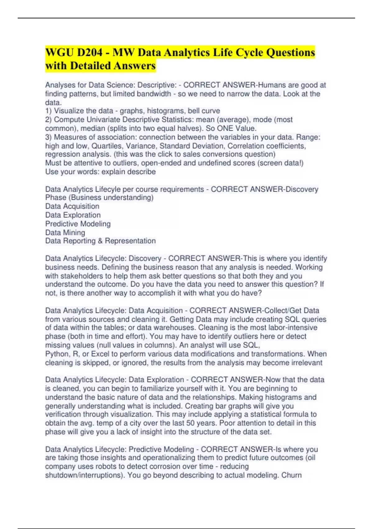 WGU D204 - MW Data Analytics Life Cycle Questions with Detailed Answers Analyses for Data Science: Descriptive: - CORRECT ANSWER-Humans are good at finding patterns, but limited bandwidth - so we need to narrow the data. Look at the data. 1) Visualize the data - graphs, histograms, bell curve 2) Compute Univariate Descriptive Statistics: mean (average), mode (most common), median (splits into two equal halves). So ONE Value. 3) Measures of association: connection between the variables in your data. Range: high and low, Quartiles, Variance, Standard Deviation, Correlation coefficients, regression analysis. (this was the click to sales conversions question) Must be attentive to outliers, open-ended and undefined scores (screen data!) Use your words: explain describe Data Analytics Lifecyle per course requirements - CORRECT ANSWER-Discovery Phase (Business understanding) Data Acquisition Data Exploration Predictive Modeling Data Mining Data Reporting & Representation Data Analytics Lifecycle: Discovery - CORRECT ANSWER-This is where you identify business needs. Defining the business reason that any analysis is needed. Working with stakeholders to help them ask better questions so that both they and you understand the outcome. Do you have the data you need to answer this question? If not, is there another way to accomplish it with what you do have? Data Analytics Lifecycle: Data Acquisition - CORRECT ANSWER-Collect/Get Data from various sources and cleaning it. Getting Data may include creating SQL queries of data within the tables; or data warehouses. Cleaning is the most labor-intensive phase (both in time and effort). You may have to identify outliers here or detect missing values (null values in columns). An analyst will use SQL, Python, R, or Excel to perform various data modifications and transformations. When cleaning is skipped, or ignored, the results from the analysis may become irrelevant Data Analytics Lifecycle: Data Exploration - CORRECT ANSWER-Now that the data is cleaned, you can begin to familiarize yourself with it. You are beginning to understand the basic nature of data and the relationships. Making histograms and generally understanding what is included. Creating bar graphs will give you verification through visualization. This may include applying a statistical formula to obtain the avg. temp of a city over the last 50 years. Poor attention to detail in this phase will give you a lack of insight into the structure of the data set. Data Analytics Lifecycle: Predictive Modeling - CORRECT ANSWER-Is where you are taking those insights and operationalizing them to predict future outcomes (oil company uses robots to detect corrosion over time - reducing shutdown/interruptions). You go beyond describing to actual modeling. Churn Analysis could be performed (evaluation of a company's customer loss repeat in order to reduce it (analyses your product and how people use it). Common mistake is to develop a model before the research question is known. Again, Python and R play key roles here. Data Analytics Lifecycle: Data Mining - CORRECT ANSWER-Find patterns and insights. Find correlations and test hypothesis. Example: data analyst has identified combinations of sales transactions that frequently occur together in data over the past 5 years. It is possible in this phase to reduce significantly the data which results in a sample size that is too small. Some call this machine learning. Python and R also play key roles here. Data Analytics Lifecycle: Data Reporting & Representation - CORRECT ANSWER-Analysts creates a story to report on data findings. Provide actionable insights that can inform decision makers; provide conclusion from the analysis in engaging manner. Effective data reporting is