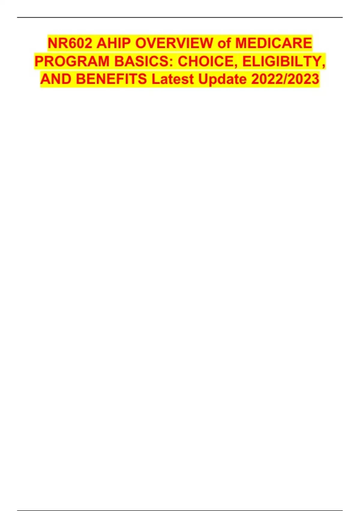 AND BENEFITS Latest Update 2022/2023 NR602 AHIP OVERVIEW of MEDICARE PROGRAM BASICS: CHOICE, ELIGIBILTY, AND BENEFITS Latest Update 2022/2023