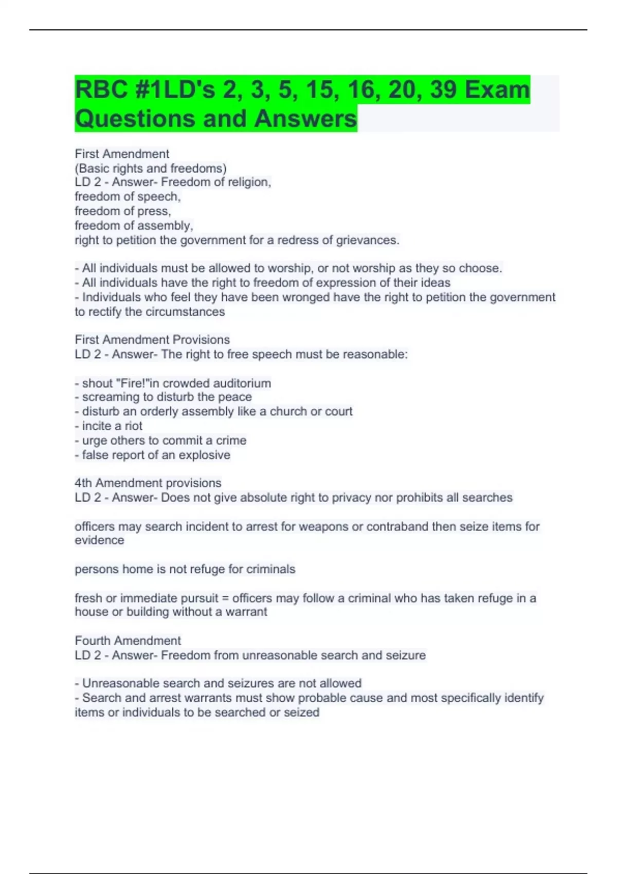 RBC #1LD's 2, 3, 5, 15, 16, 20, 39 Exam Questions and Answers