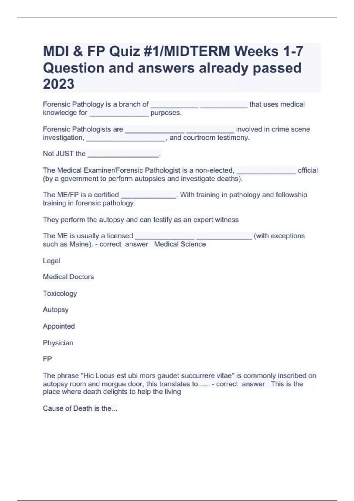 MDI & FP Quiz #1/MIDTERM Weeks 1-7 Question and answers already passed 2023 Forensic Pathology is a branch of ____________ ____________ that uses medical knowledge for _______________ purposes. Forensic Pathologists are _______________ ____________ involved in crime scene investigation, ____________________, and courtroom testimony. Not JUST the __________________. The Medical Examiner/Forensic Pathologist is a non-elected, _______________ official (by a government to perform autopsies and investigate deaths). The ME/FP is a certified ______________. With training in pathology and fellowship training in forensic pathology. They perform the autopsy and can testify as an expert witness The ME is usually a licensed _______________ ______________ (with exceptions such as Maine). - correct answer Medical Science Legal Medical Doctors Toxicology