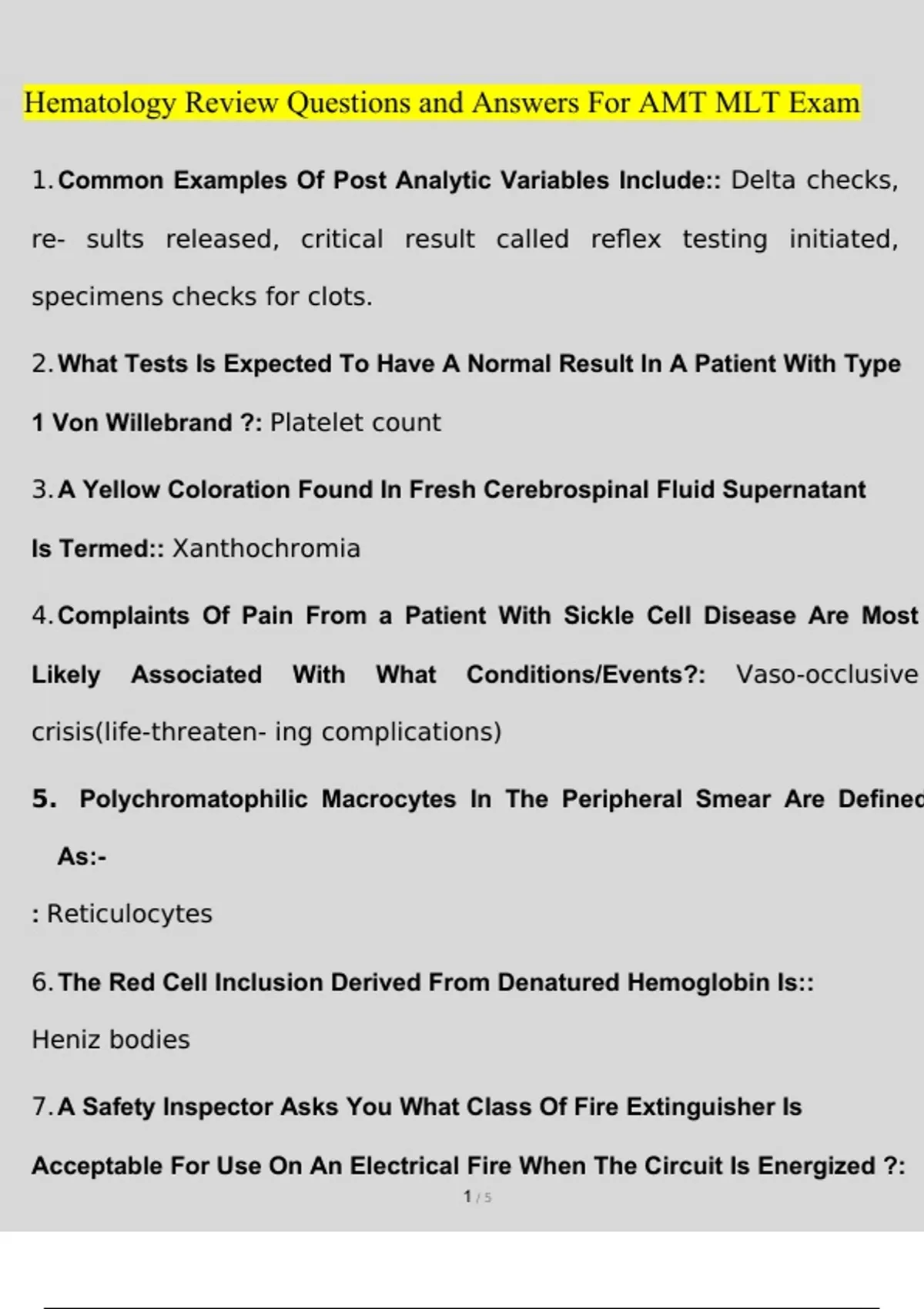 Hematology Review Questions and Answers For AMT MLT Exam Questions and Answers 2023 (Verified Answers by Expert)