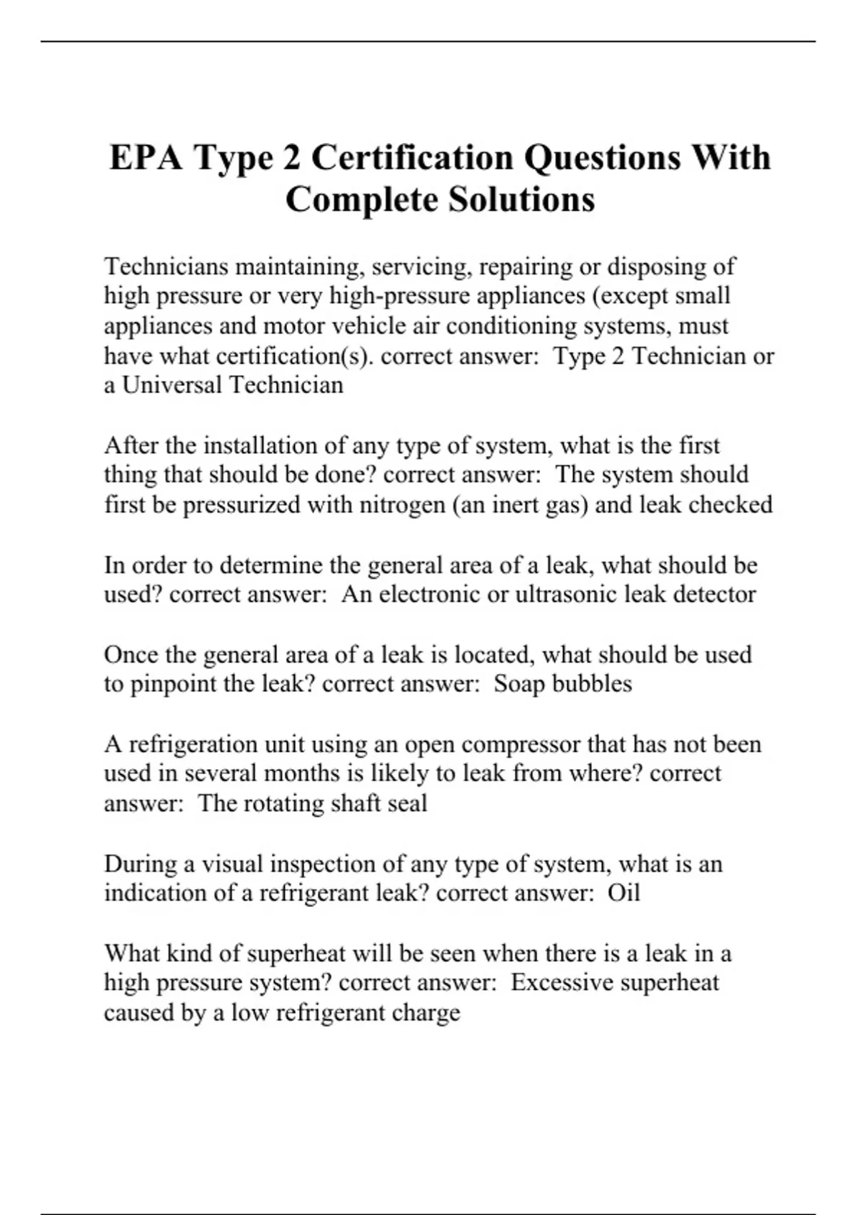 Technicians maintaining, servicing, repairing or disposing of high pressure or very high-pressure appliances (except small appliances and motor vehicle air conditioning systems, must have what certification(s). correct answer: Type 2 Technician or a Universal Technician After the installation of any type of system, what is the first thing that should be done? correct answer: The system should first be pressurized with nitrogen (an inert gas) and leak checked In order to determine the general area of a leak, what should be used? correct answer: An electronic or ultrasonic leak detector Once the general area of a leak is located, what should be used to pinpoint the leak? correct answer: Soap bubbles A refrigeration unit using an open compressor that has not been used in several months is likely to leak from where? correct answer: The rotating shaft seal During a visual inspection of any type of system, what is an indication of a refrigerant leak? correct answer: Oil What kind of superheat will be seen when there is a leak in a high pressure system? correct answer: Excessive superheat caused by a low refrigerant charge EPA regulations require that all comfort cooling appliances