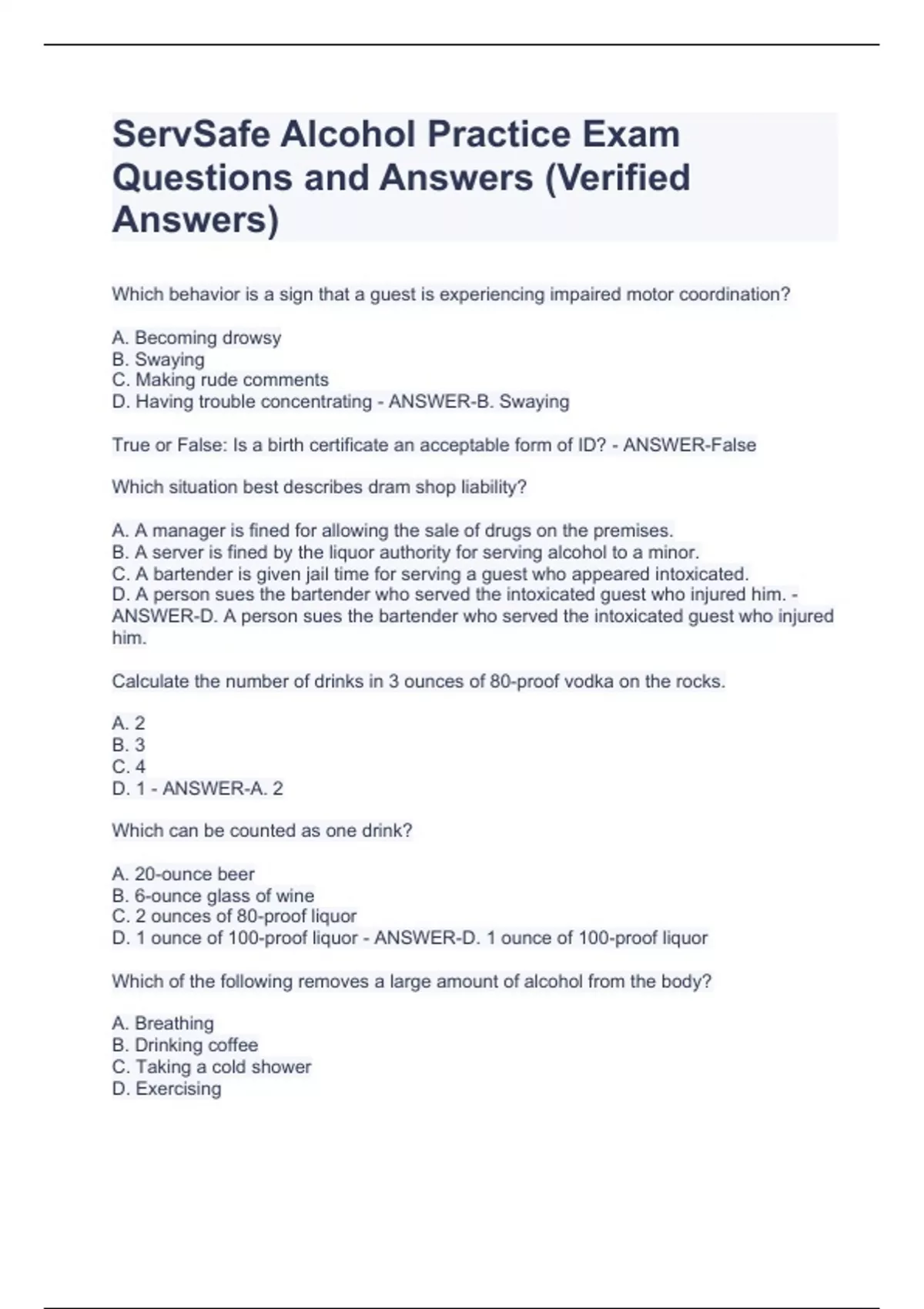 D. 1 ounce of 100-proof liquor - ANSWER-D. 1 ounce of 100-proof liquor