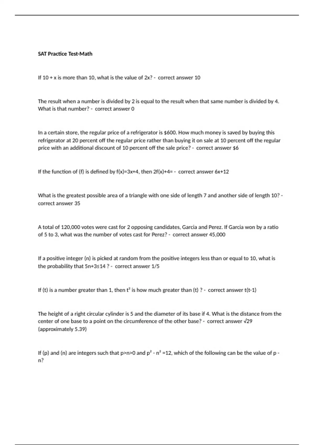 If 10 + x is more than 10, what is the value of 2x? - correct answer 10 The result when a number is divided by 2 is equal to the result when that same number is divided by 4. What is that number? - correct answer 0 In a certain store, the regular price of a refrigerator is $600. How much money is saved by buying this refrigerator at 20 percent off the regular price rather than buying it on sale at 10 percent off the regular price with an additional discount of 10 percent off the sale price? - correct answer $6 If the function of (f) is defined by f(x)=3x+4, then 2f(x)+4= - correct answer 6x+12 What is the greatest possible area of a triangle with one side of length 7 and another side of length 10? - correct answer 35 A total of 120,000 votes were cast for 2 opposing candidates, Garcia and Perez. If Garcia won by a ratio of 5 to 3, what was the number of votes cast for Perez? - correct answer 45,000 If a positive integer (n) is picked at random from the positive integers less than or equal to 10, what is the probability that 5n+3≤14 ? - correct answer 1/5 If (t) is a number greater than 1, then t² is how much greater than (t) ? - correct answer t(t-1) The height of a right circular cylinder is 5 and the diameter of its base if 4. What is the distance from the center of one base to a point on the circumference of the other base? - correct answer √29 (approximately 5.39) If (p) and (n) are integers such that p>n>0 and p² - n² =12, which of the following can be the value of p - n?