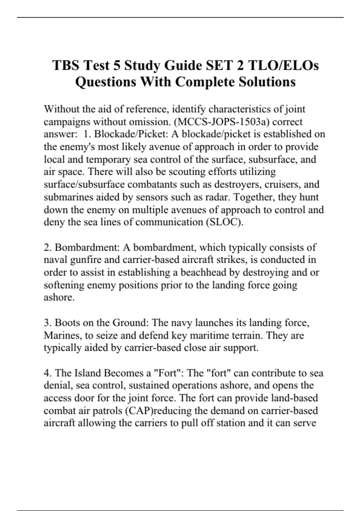Without the aid of reference, identify characteristics of joint campaigns without omission. (MCCS-JOPS-1503a) correct answer: 1. Blockade/Picket: A blockade/picket is established on the enemy's most likely avenue of approach in order to provide local and temporary sea control of the surface, subsurface, and air space. There will also be scouting efforts utilizing surface/subsurface combatants such as destroyers, cruisers, and submarines aided by sensors such as radar. Together, they hunt down the enemy on multiple avenues of approach to control and deny the sea lines of communication (SLOC). 2. Bombardment: A bombardment, which typically consists of naval gunfire and carrier-based aircraft strikes, is conducted in order to assist in establishing a beachhead by destroying and or softening enemy positions prior to the landing force going ashore. 3. Boots on the Ground: The navy launches its landing force, Marines, to seize and defend key maritime terrain. They are typically aided by carrier-based close air support. 4. The Island Becomes a "Fort": The "fort" can contribute to sea denial, sea control, sustained operations ashore, and opens the access door for the joint force. The fort can provide land-based combat air patrols (CAP)reducing the demand on carrier-based aircraft allowing the carriers to pull off station and it can serve as a launching pad for Anti Access/Area Denial (A2/AD) weapon systems such as ballistic missiles. It also serves as an advanced base and logistical hub that gives the joint force a